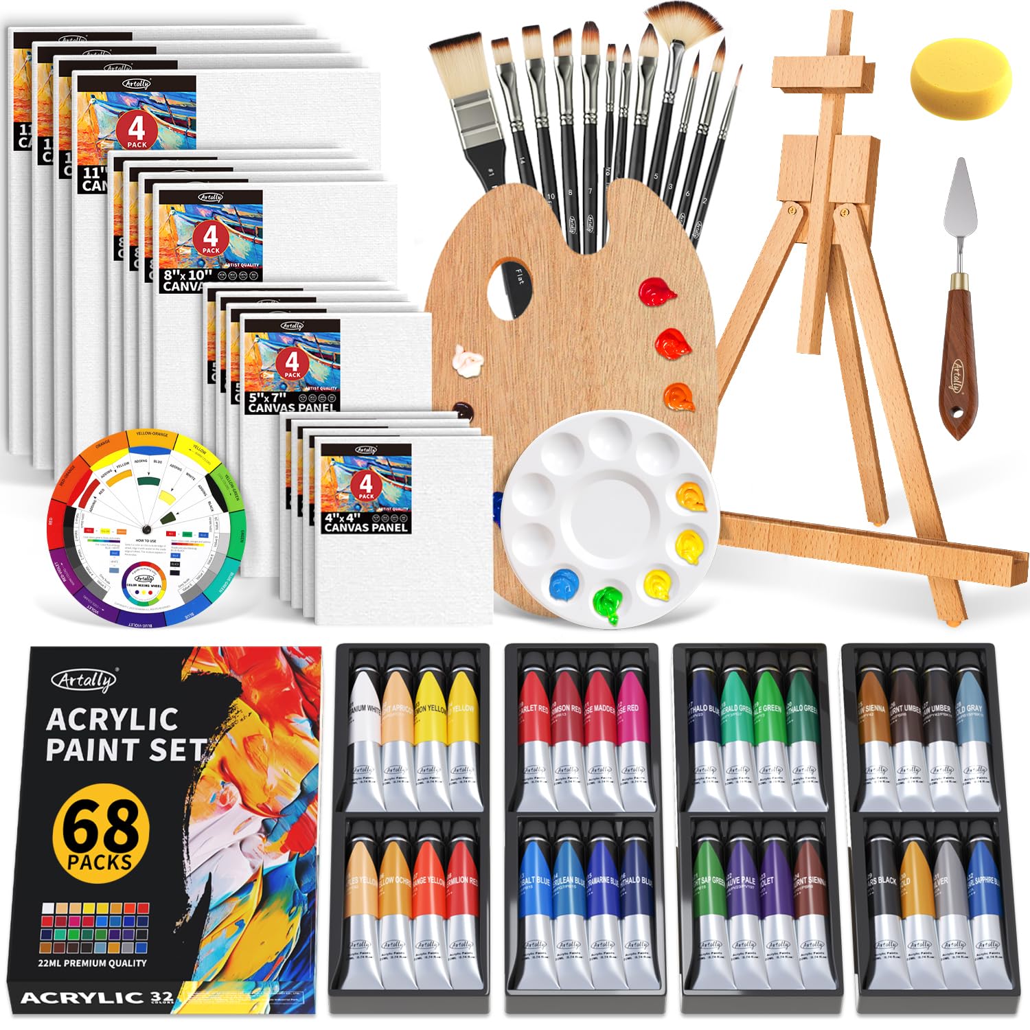 ARTALLY Juego de pintura acrílica para adultos y niños, 67 piezas de pintura en lienzo, pintura acrílica de 32 colores (0.7 fl oz)