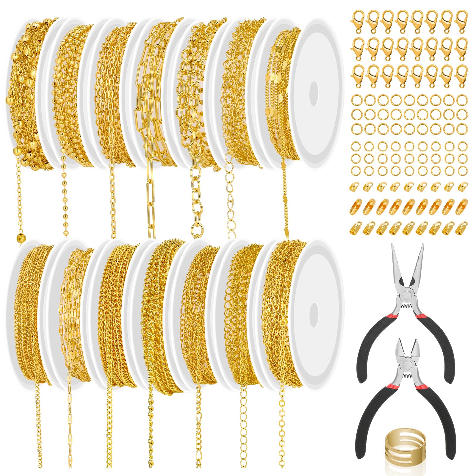 Tinctish Kit de fabricación de joyas de 14 rollos – Cadenas de collar de oro de 102 pies (cobre y acero inoxidable) con 2 alicates