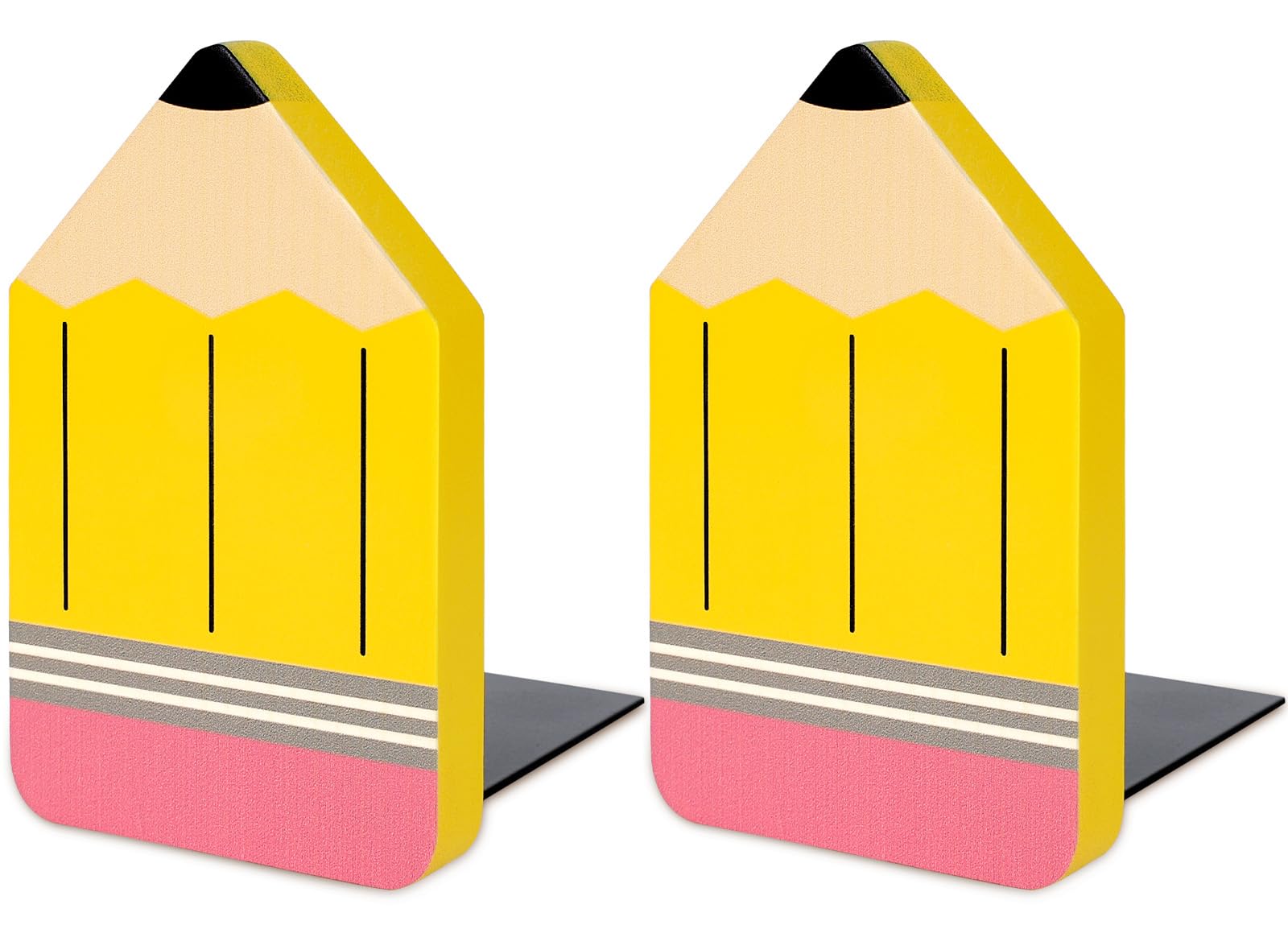 Whaline 2 sujetalibros de madera con forma de lápiz, sujetalibros de madera para el regreso a clases, soportes de madera amarillos