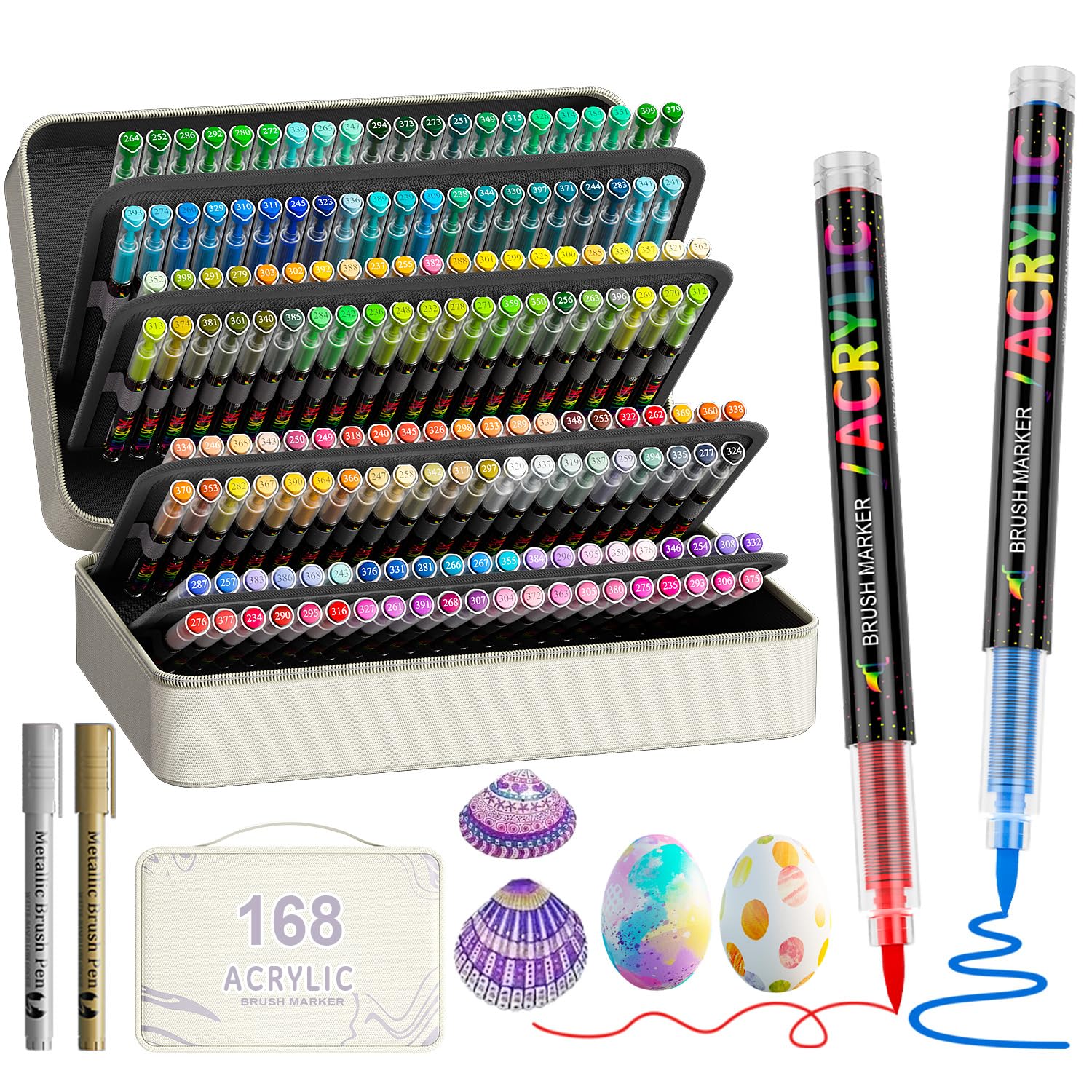 Marcadores de pintura acrílica de 168 + 2 colores con estuche de transporte, bolígrafos acrílicos de punta de pincel suave, escrit