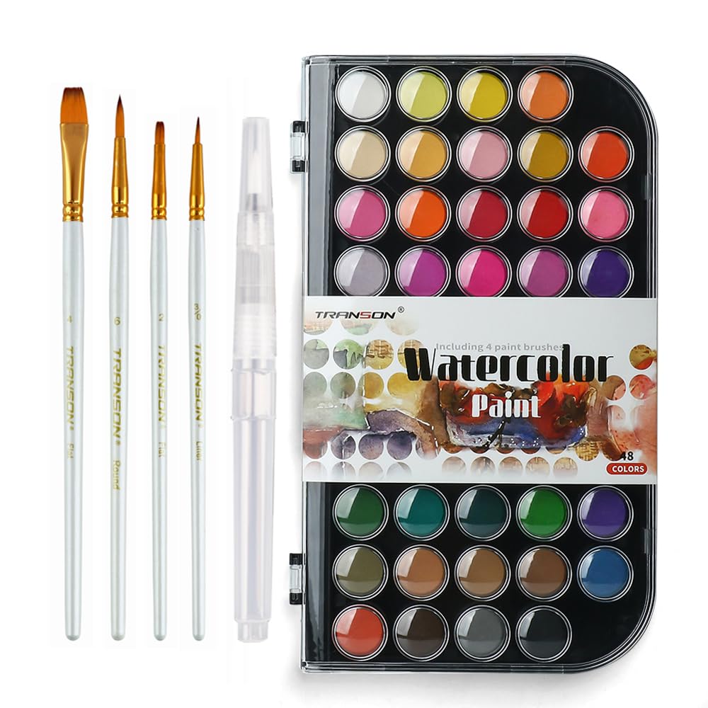 TRANSON Juego de pintura de acuarela de 48 colores con 4 pinceles de pintura y 1 pincel de agua para adultos, estudiantes, princip
