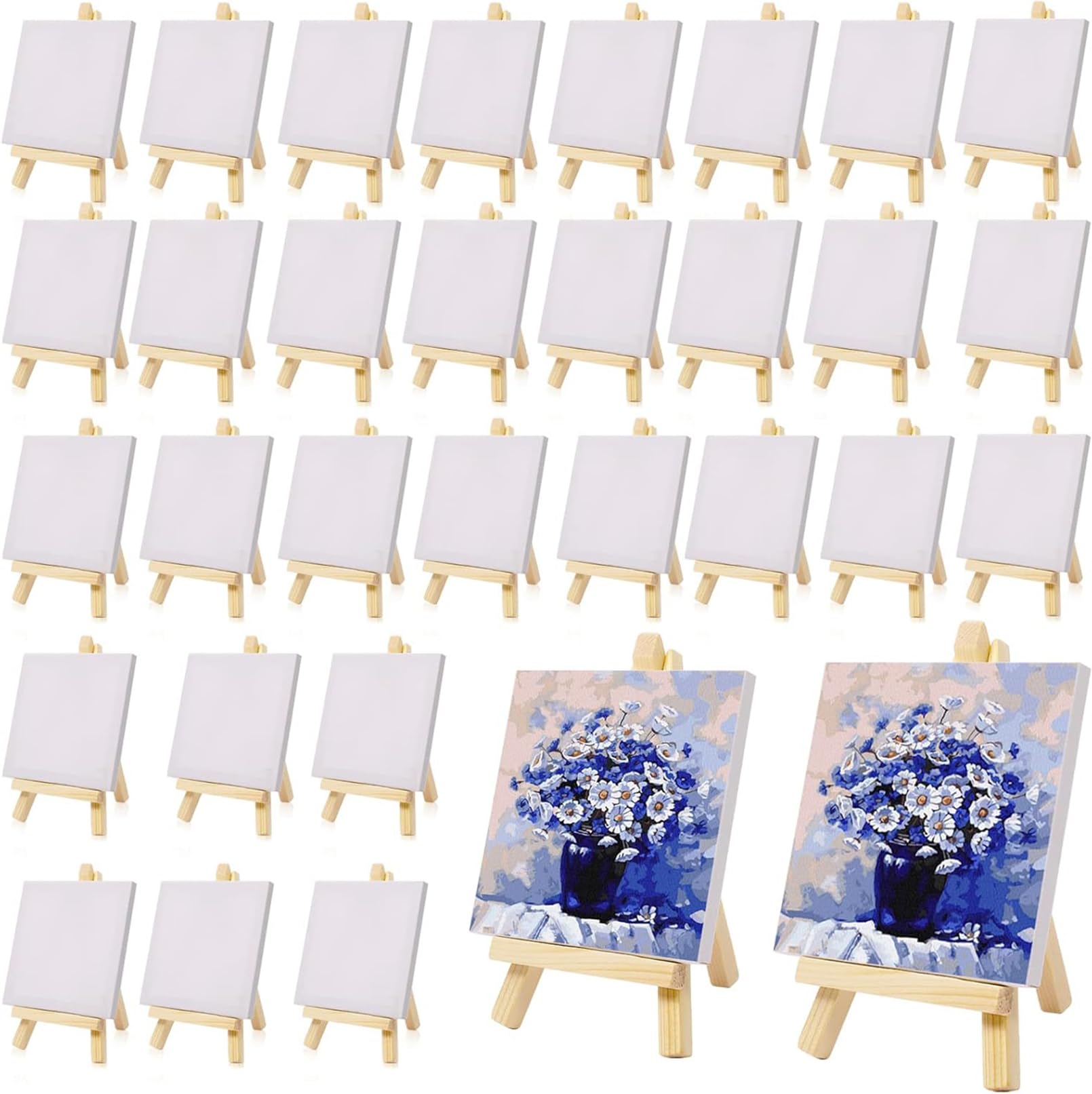 Paquete de 32 mini lienzos estirados, mini lienzo y caballete, lienzos de arte de 4 x 4 pulgadas, lienzos pequeños para niños, pin