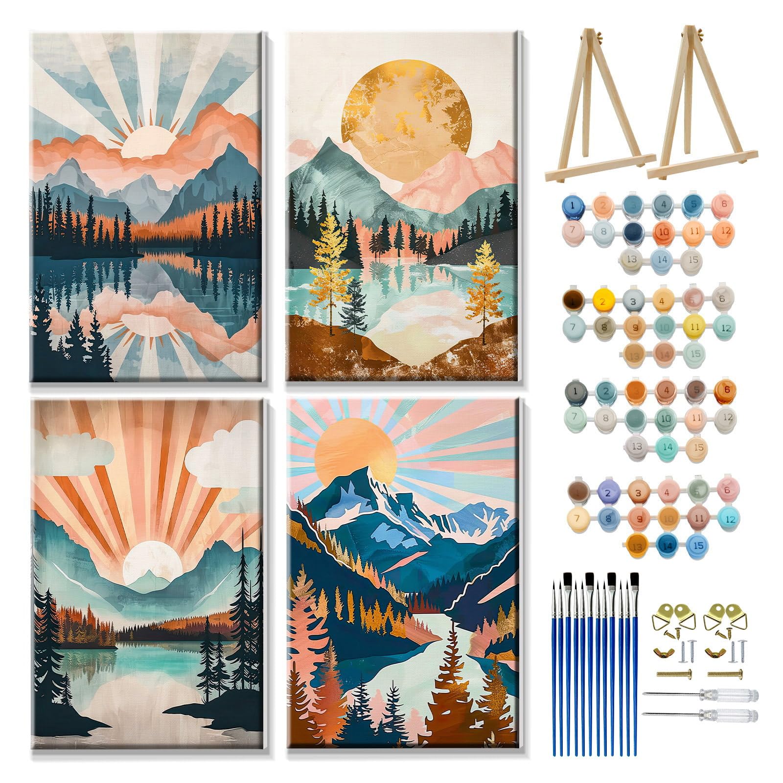 JOOZ Paquete de 4 pinturas por números para adultos con marco, pintura de montaña por número con caballete lago para adultos, kit