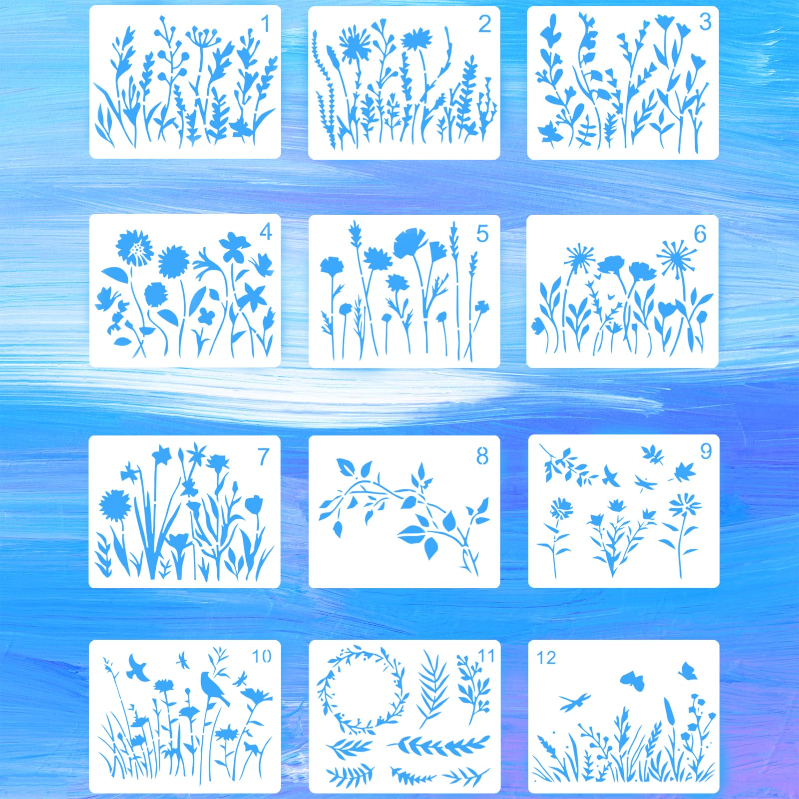 Flower Stencils for Painting, Large Reusable Plastic Stencil Crafts, 12 PCS 6 x 4.8 Inch Floral Grass Painting Stencils Drawing Te