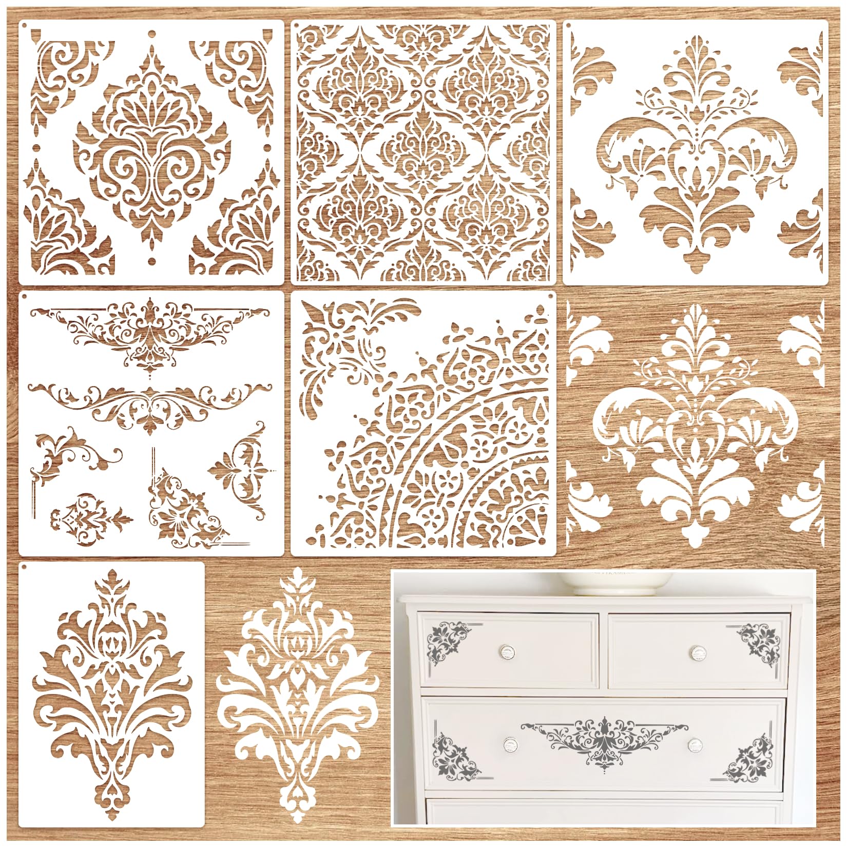 Plantillas grandes de damasco para paredes, plantillas de borde de esquina de dibujo, plantillas reutilizables de 12 pulgadas para