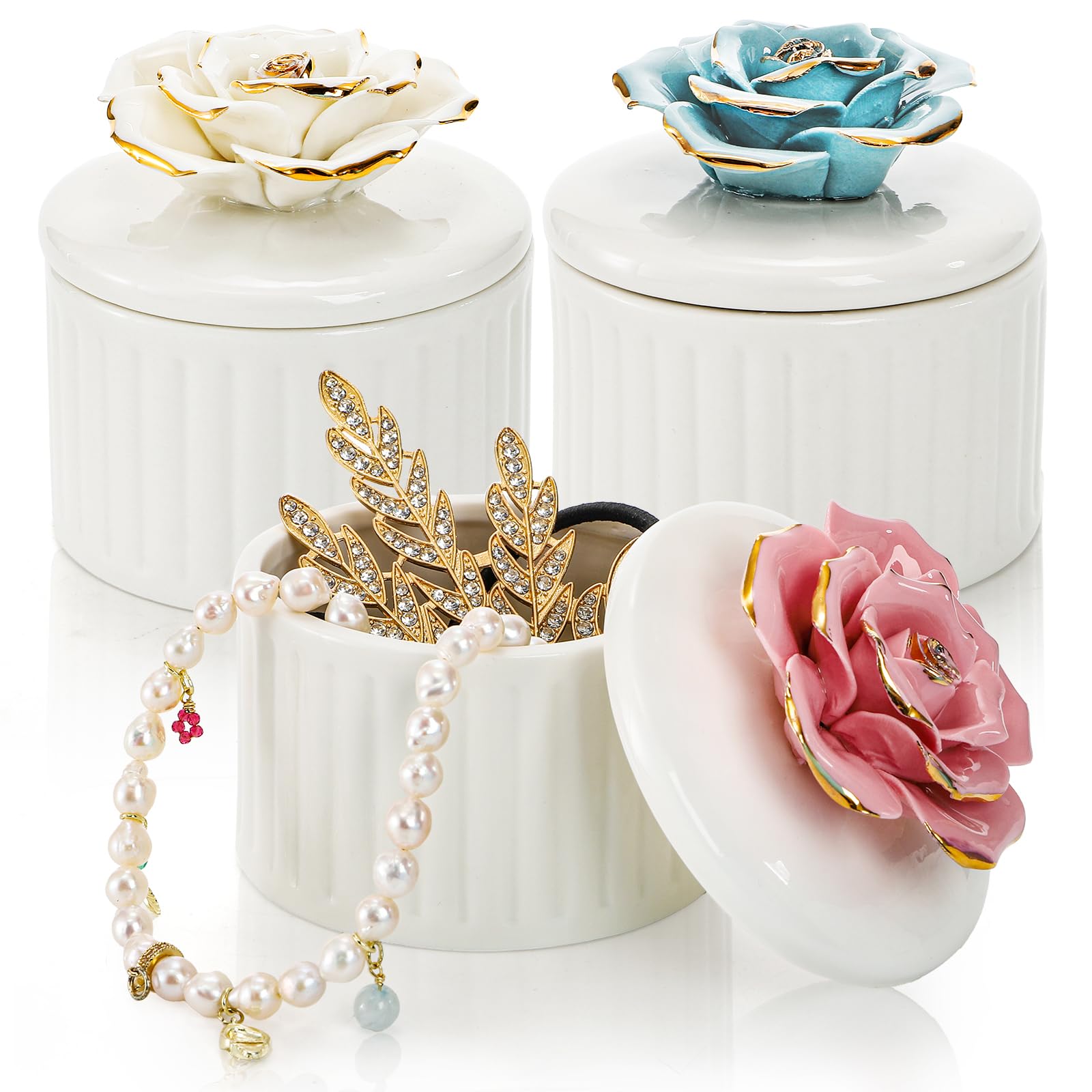ZOOFOX Paquete de 3 cajas de joyería de cerámica, organizador de joyas vintage decorativo para mujeres, caja de regalo pequeña par