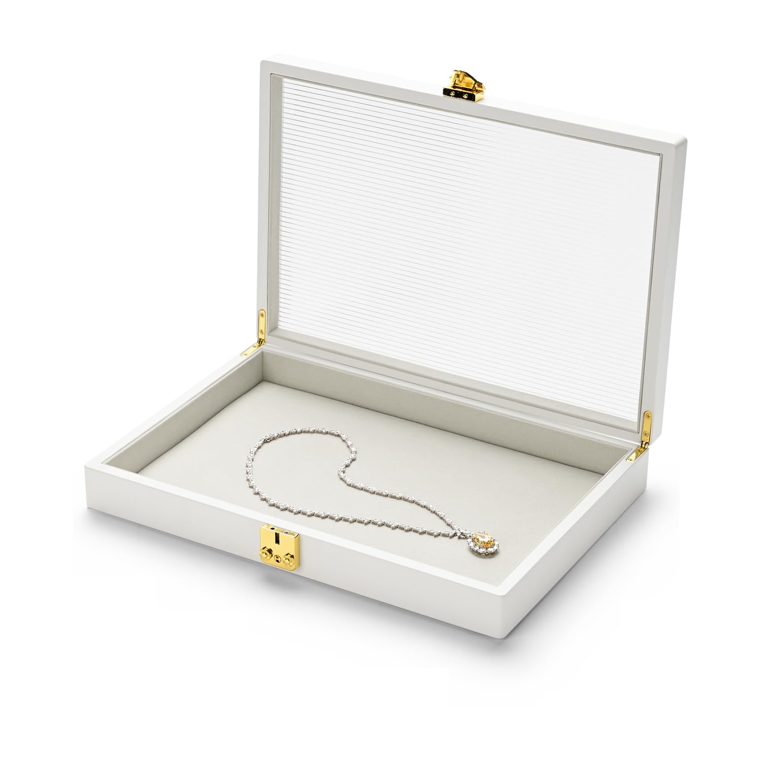 Oirlv Bandeja organizadora de joyas de cuero blanco de alta calidad con tapa transparente con cerradura, caja de soporte para coll