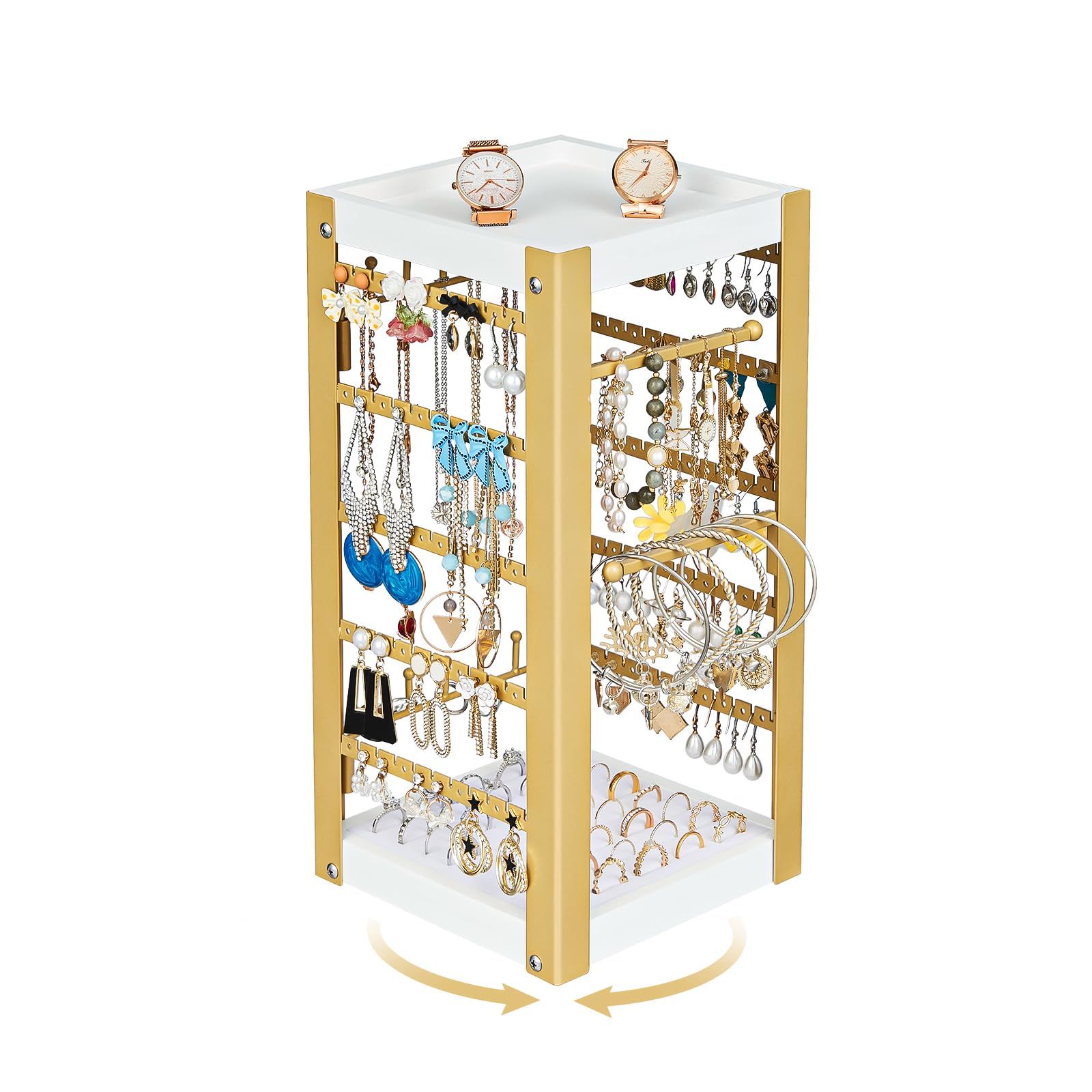 keomaisyto Organizador giratorio de joyas, organizador de aretes de 360 grados con bandeja para anillos, collares y ganchos para p