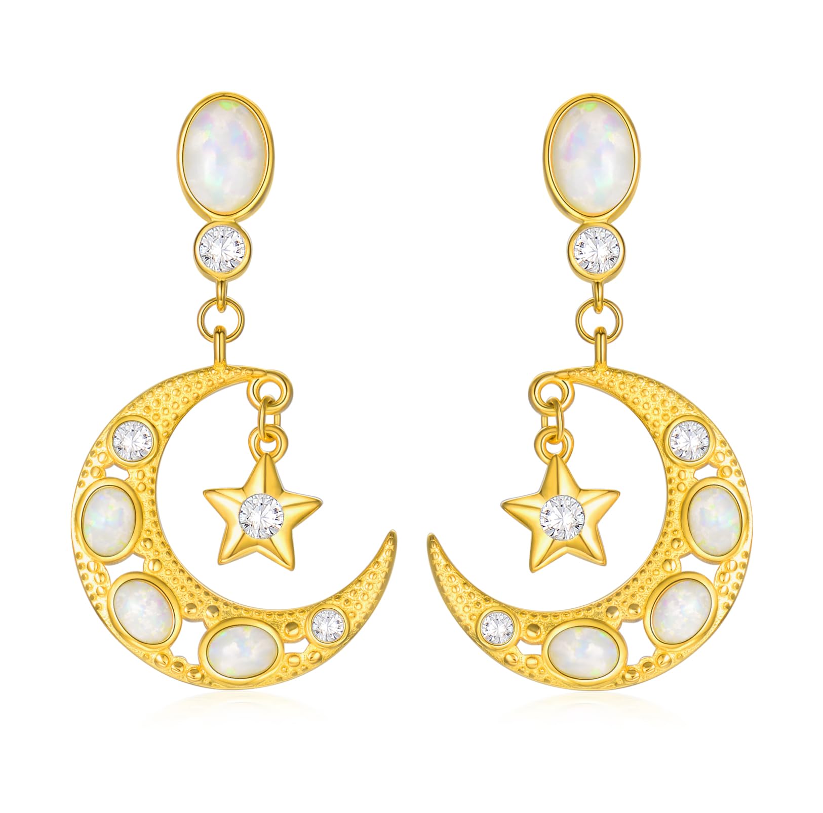 Aretes de plata de ley chapados en oro de 18 quilates con luna y estrella de ópalo para mujer, aretes de media luna de moissanita