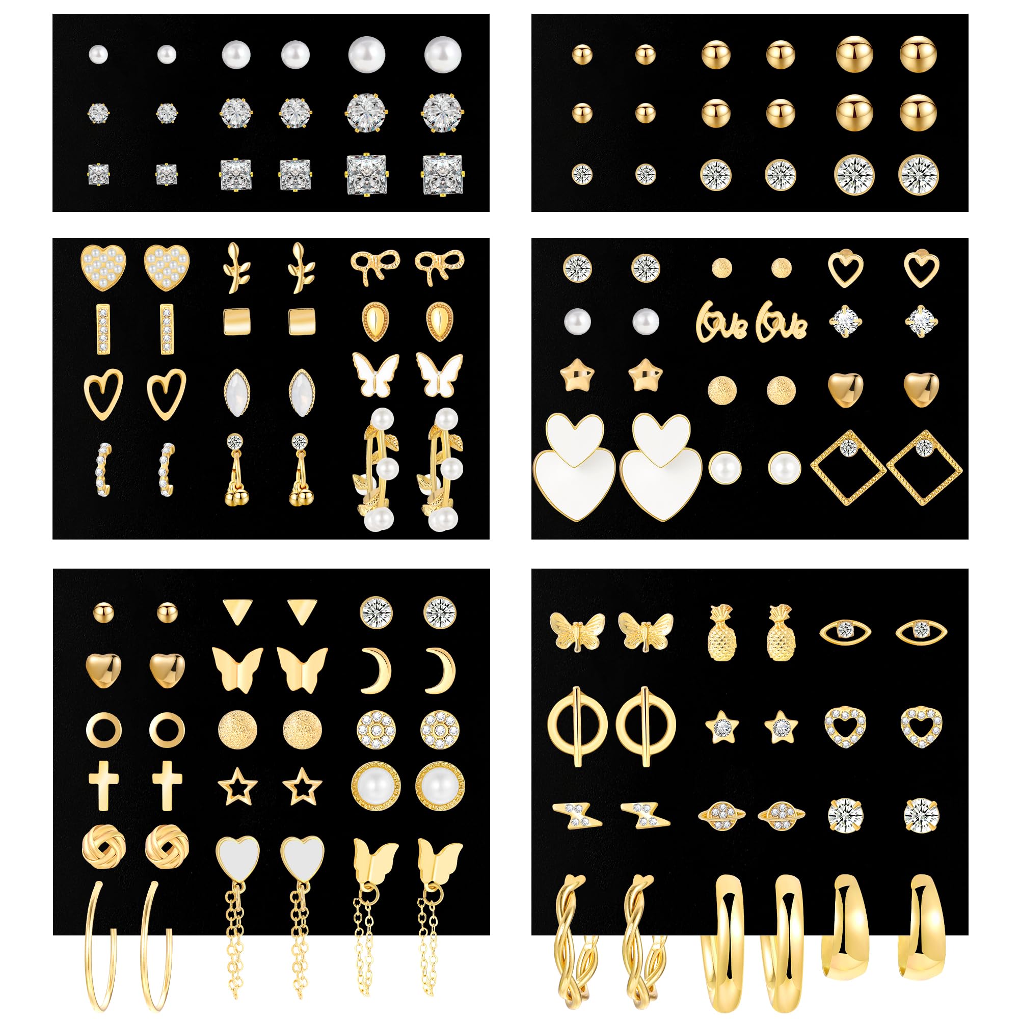 Juego de 70 pares de aretes de oro para mujer, paquete múltiple, hipoalergénicos a la moda, aretes de circonita cúbica, aretes gru