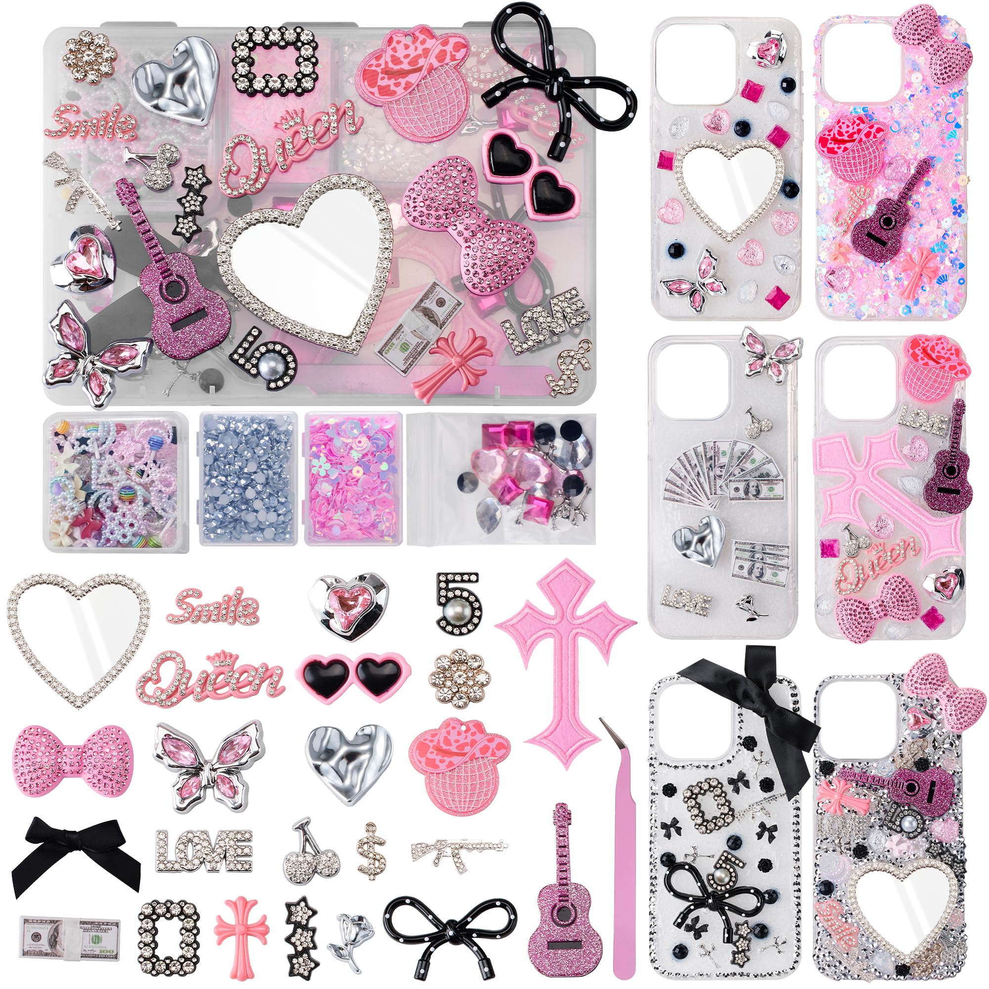 Kit de dijes de basura con espejo de maquillaje, funda de teléfono basura con dijes grandes, diamantes de imitación de lazo de uña