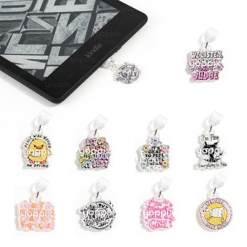 9 dijes para lector electrónico, sobre divertido tema de polvo, compatible con puerto de carga tipo C, regalo para lectores amante