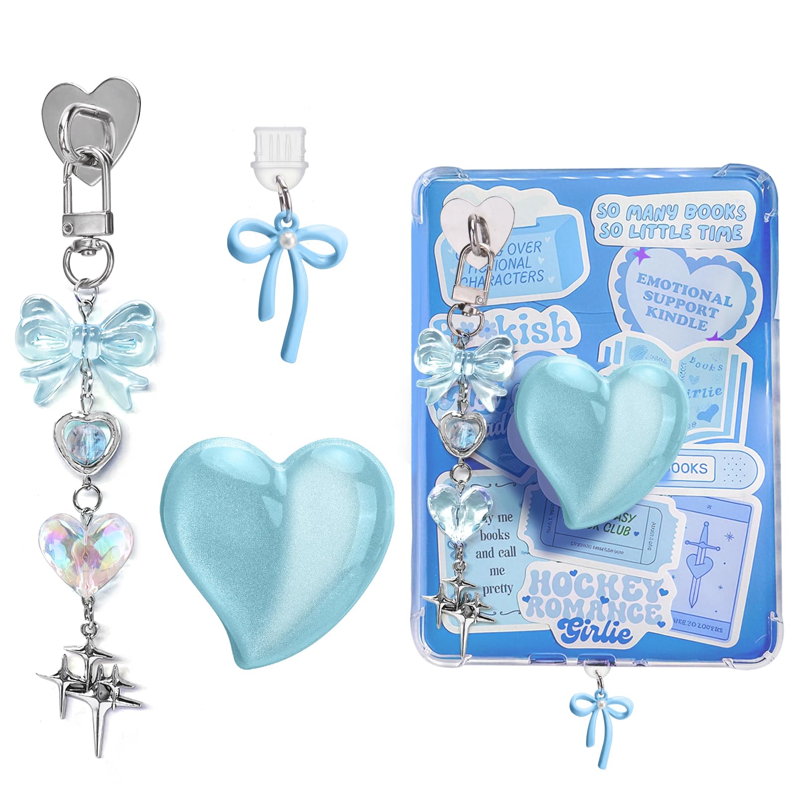 AIERSA Bonito juego de dijes para Kindle, incluye tapón antipolvo tipo C/USB C, soporte de agarre de corazón azul, llaveros brilla