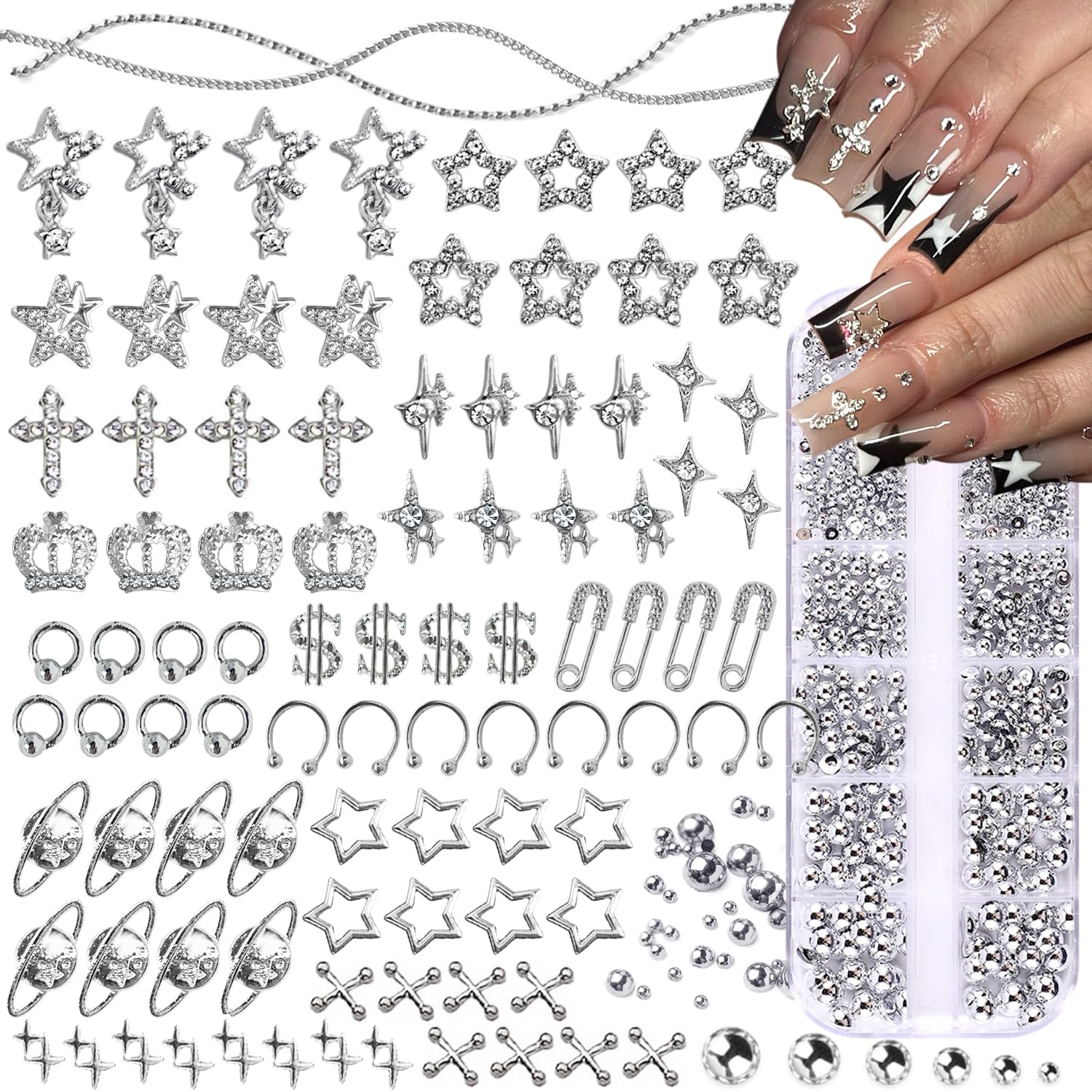 92 dijes de uñas de estrella, 1 caja de perlas plateadas para hacer manualidades con parte trasera plana, cruz planeta de metal pl