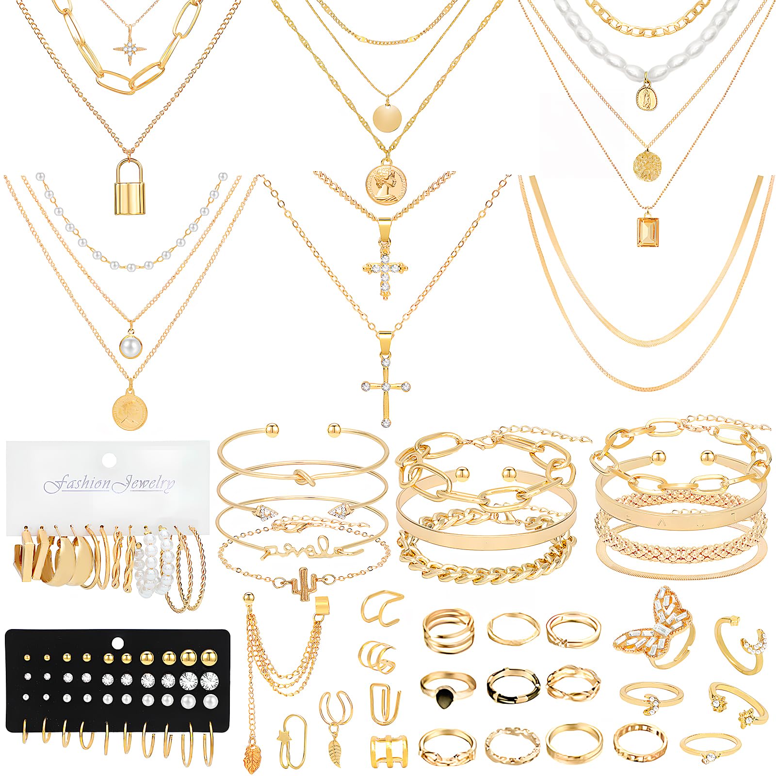 Juego de 65 joyas de oro con 6 collares en capas, 11 tobilleras y 7 aretes de oreja, 11 aretes de aro, 15 anillos, 15 aretes de tu