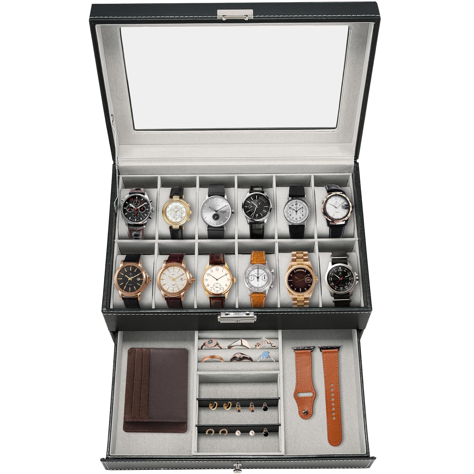Cajas de almacenamiento de reloj de piel sintética con 12 ranuras | Organizador de relojes de 2 niveles, para hombres y mujeres, c