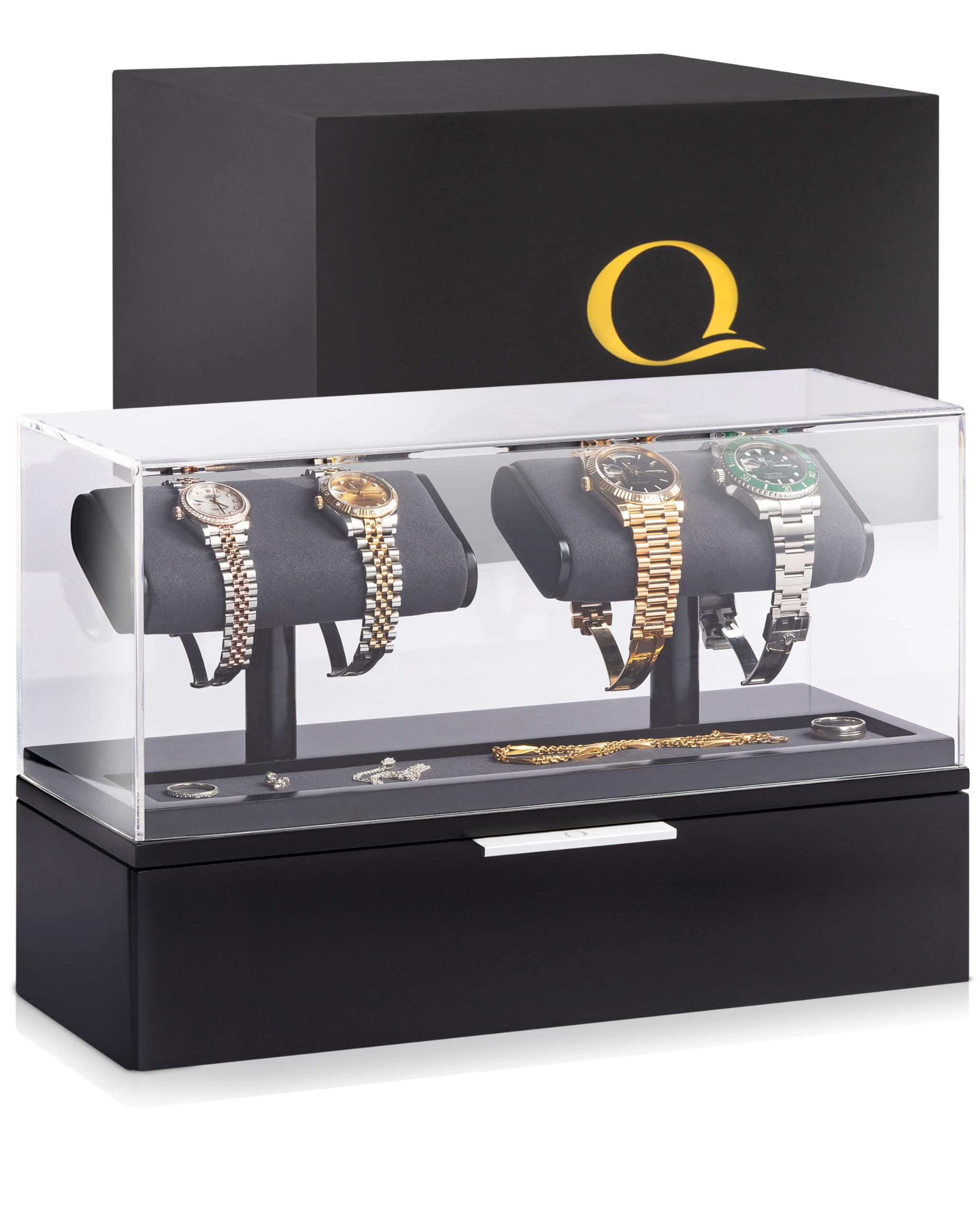 QWATCH – Caja de acrílico para 2 o 4 relojes con bandeja de valet de joyería y cajón