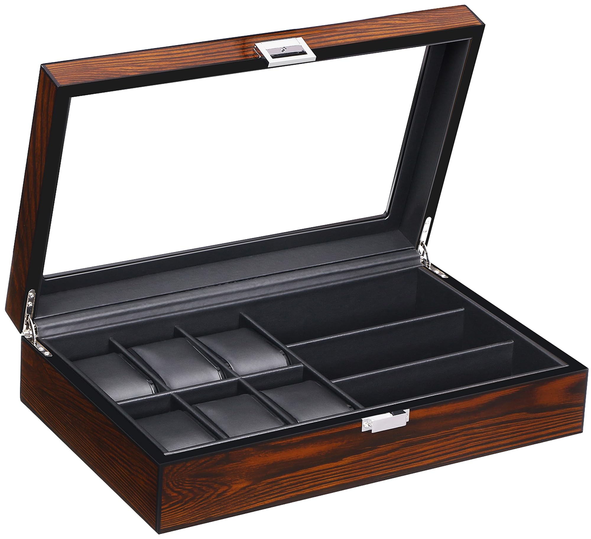 ProCase Joyero de madera con acabado lacado, organizador de 6 ranuras para relojes y gafas de sol para hombres, vitrinas de 2 nive