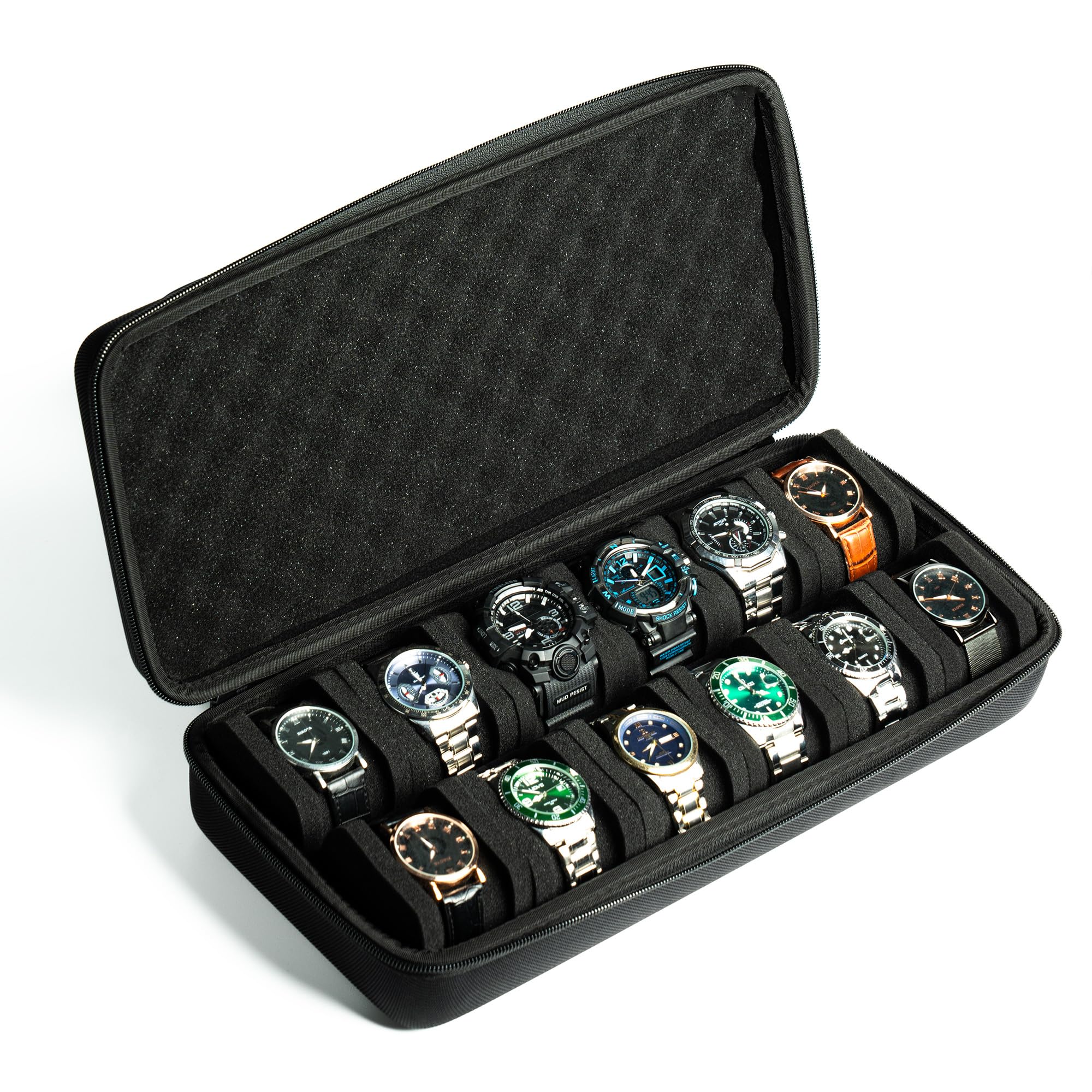 Caja de reloj de 12 ranuras, caja de viaje dura para reloj, caja de almacenamiento, funda acolchada para exhibición y organización