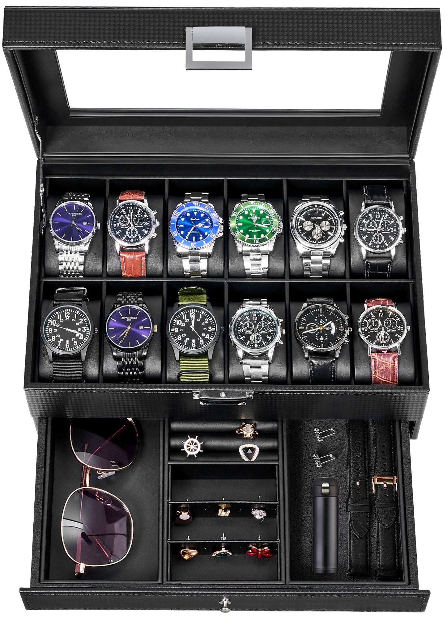 BEWISHOME Caja de reloj de 12 ranuras con cajón de valet, vitrina de lujo para hombres, organizador con joyas, tapa de cristal rea
