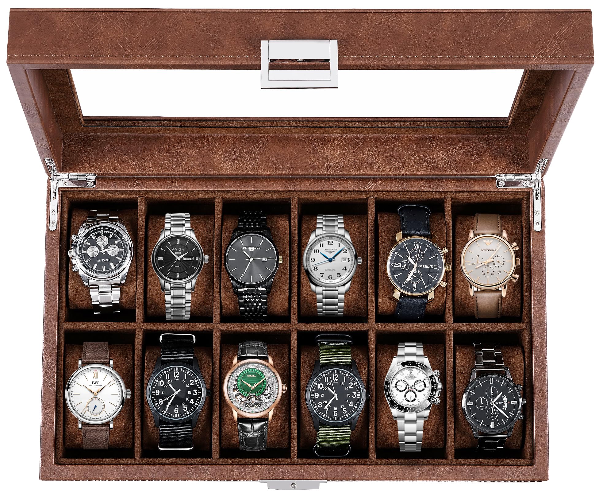 BEWISHOME Caja de reloj, caja de reloj de 12 ranuras con tapa de vidrio grande, caja de reloj para hombre, organizador de caja de