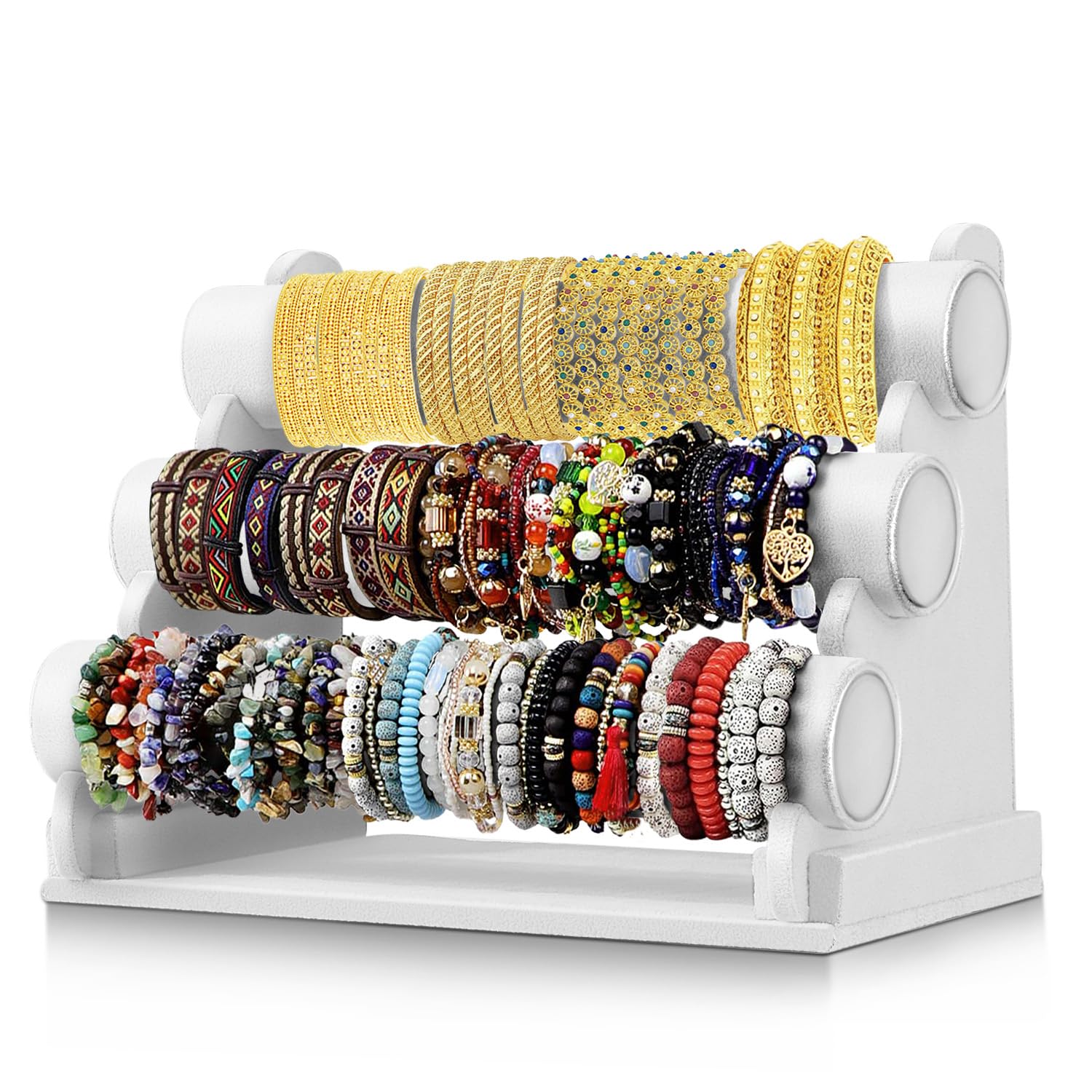 Flexzion Soporte de joyería de terciopelo blanco de 3 niveles con barra en T, estante de almacenamiento – Collar extraíble, pulser
