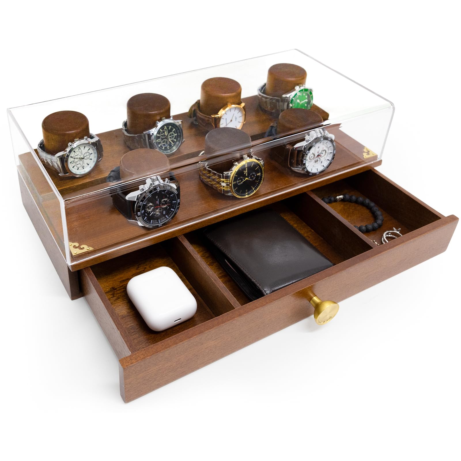 Caja de reloj de madera, caja de reloj de 2 niveles para hombres, soporte de exhibición de reloj con cajón para colección de reloj