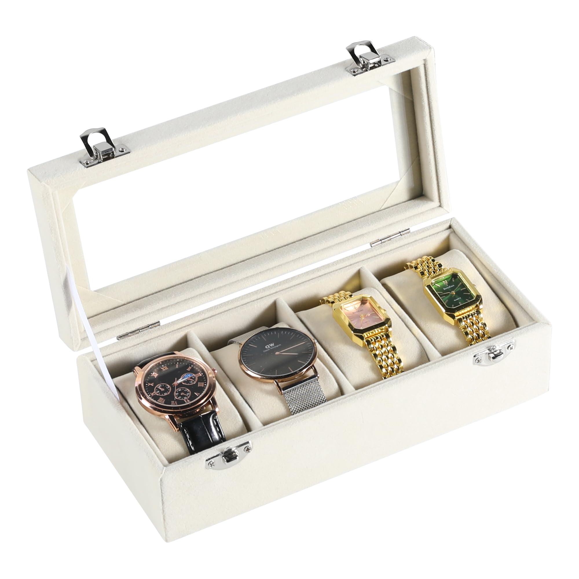 Frebeauty Caja de reloj de 4 ranuras, funda de terciopelo con tapa de cristal, caja organizadora de relojes para hombres y mujeres