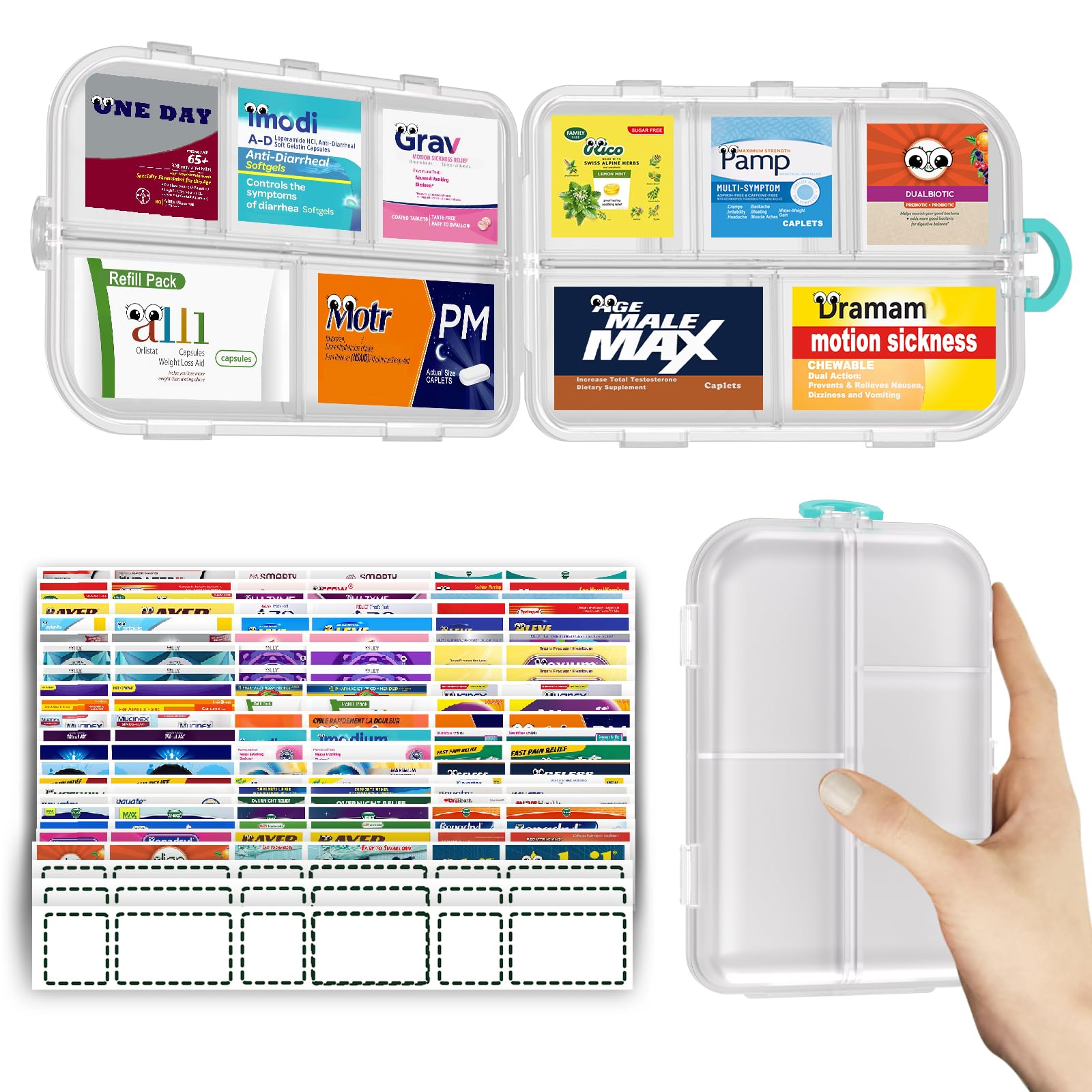 Organizador de píldoras con etiquetas para medicamentos, contenedor de píldoras diario de viaje, mini organizador de medicamentos,