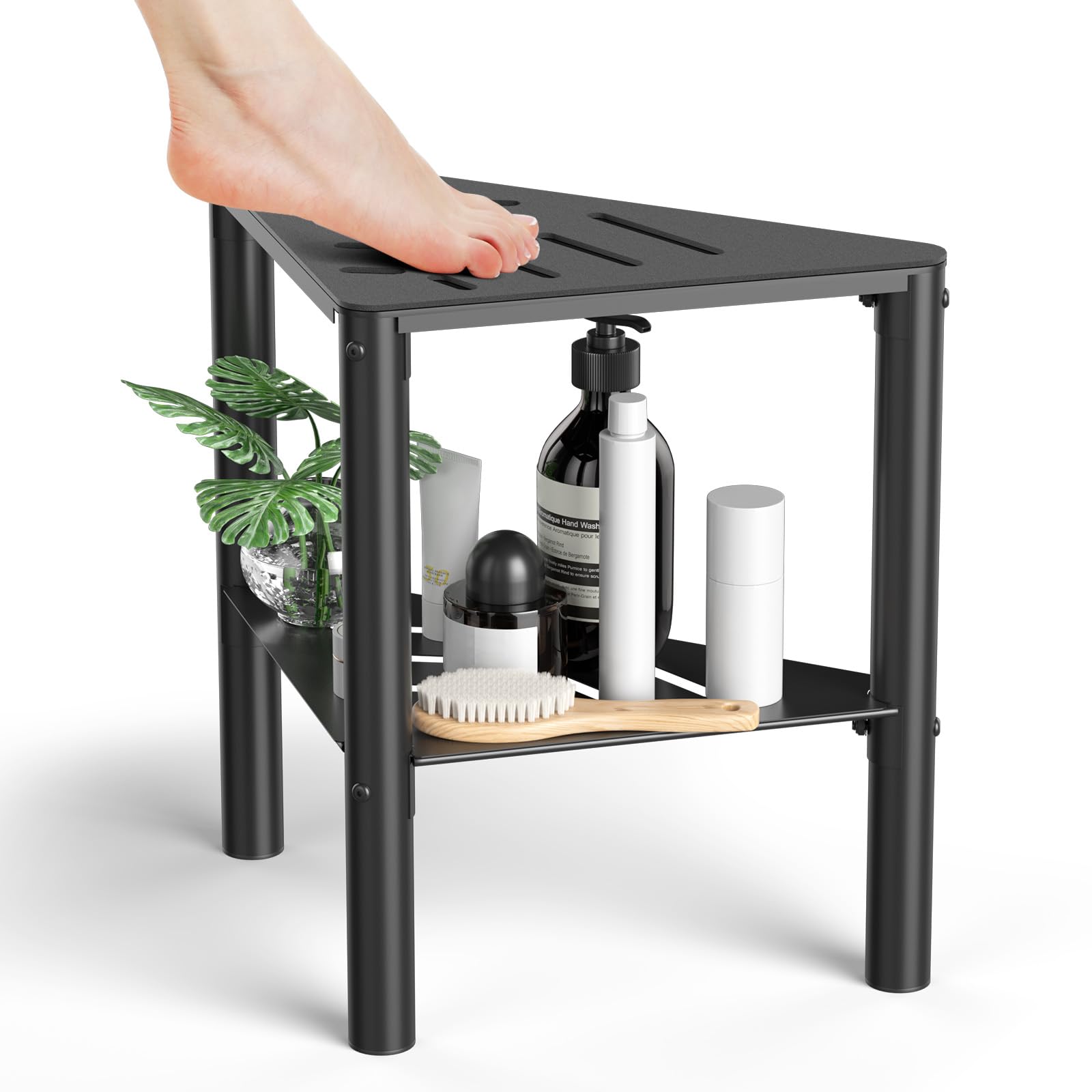Reposapiés de ducha para afeitarse las piernas, banco de baño de esquina pequeño (negro, grande)