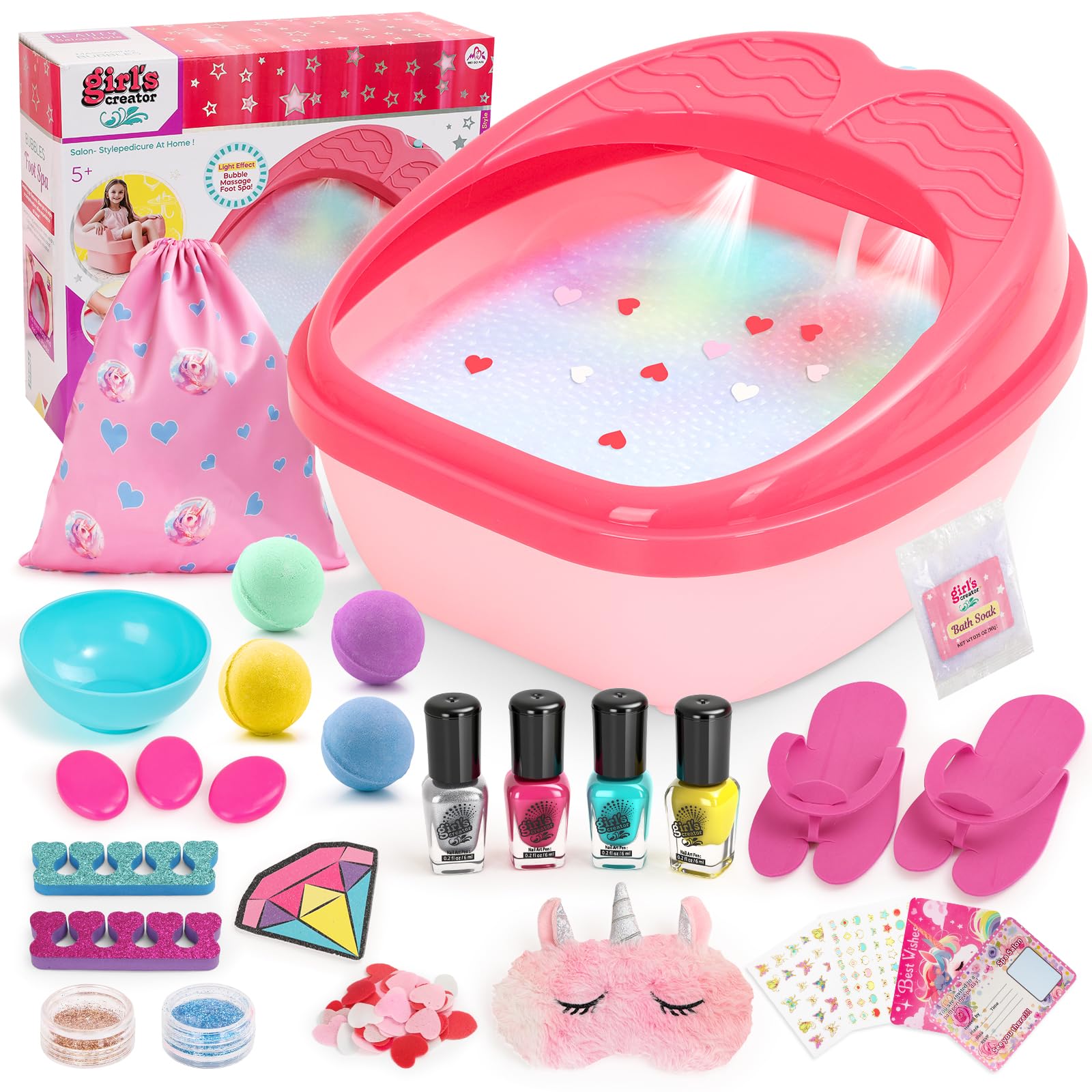 Spa de pies para niños con kit de uñas para niñas de 4 a 12 años, todo en 1, kit de juguetes de pedicura para niños con luces colo