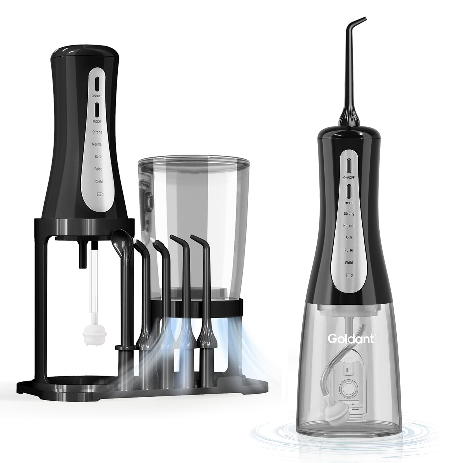 Flosser dental de agua de 11.8 fl oz con soporte de almacenamiento conveniente, 5 modos de irrigador oral inalámbrico portátil, re