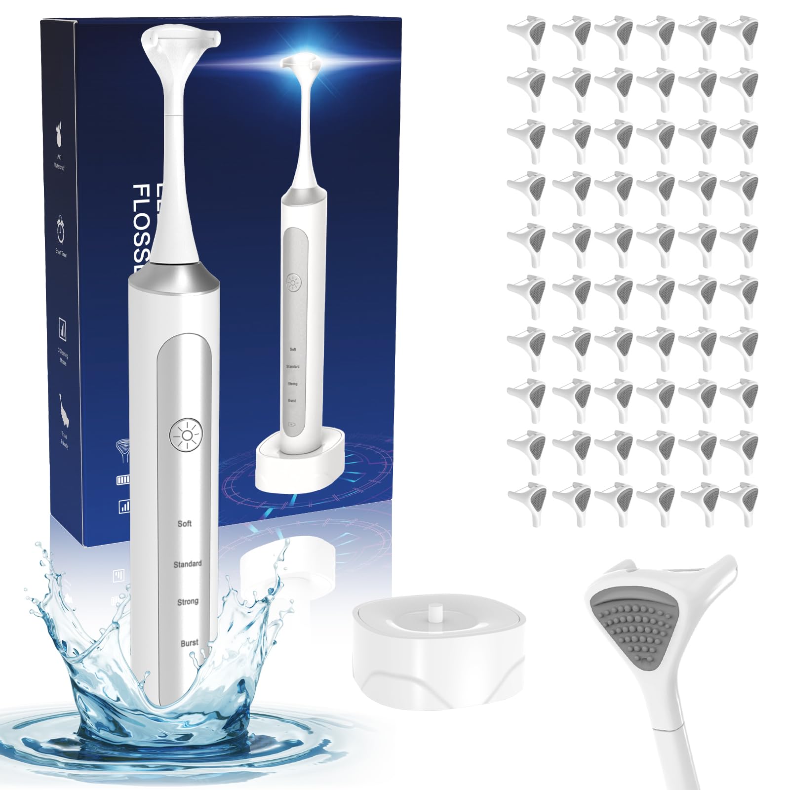 Hilo dental eléctrico con 4 velocidades, 60 cabezales de repuesto, recargable, raspador de lengua/limpiador, hilo dental eléctrico