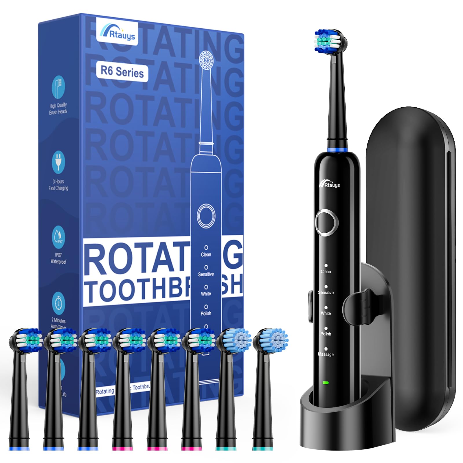 Rtauys Cepillo de dientes eléctrico giratorio R6 para adultos, carga rápida, viene con 8 cabezales de cepillo (2 tipos) y estuche