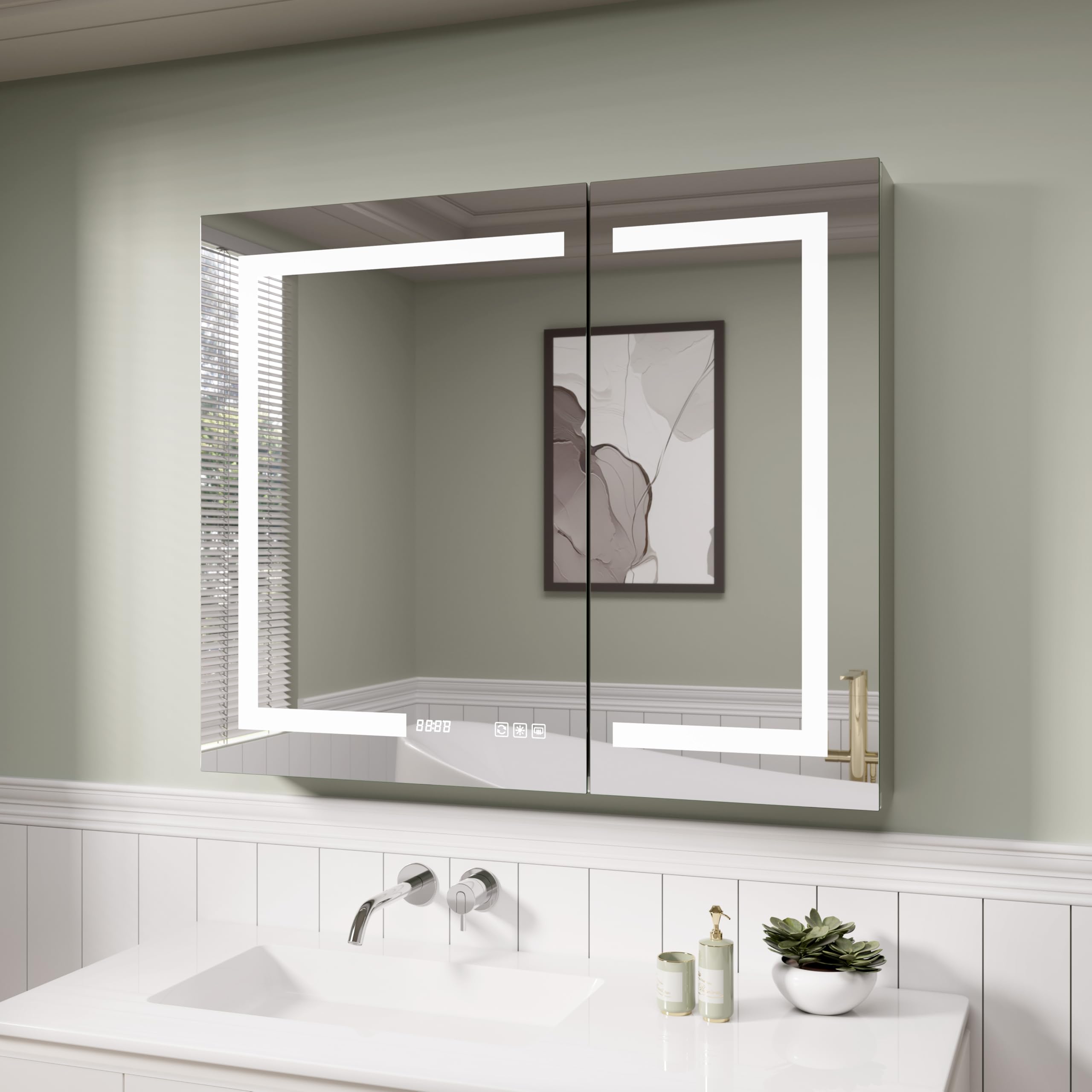 Botiquín de baño iluminado con espejo de 36 x 30 pulgadas, empotrado o en superficie, para montar en la pared, con luces, desempañ