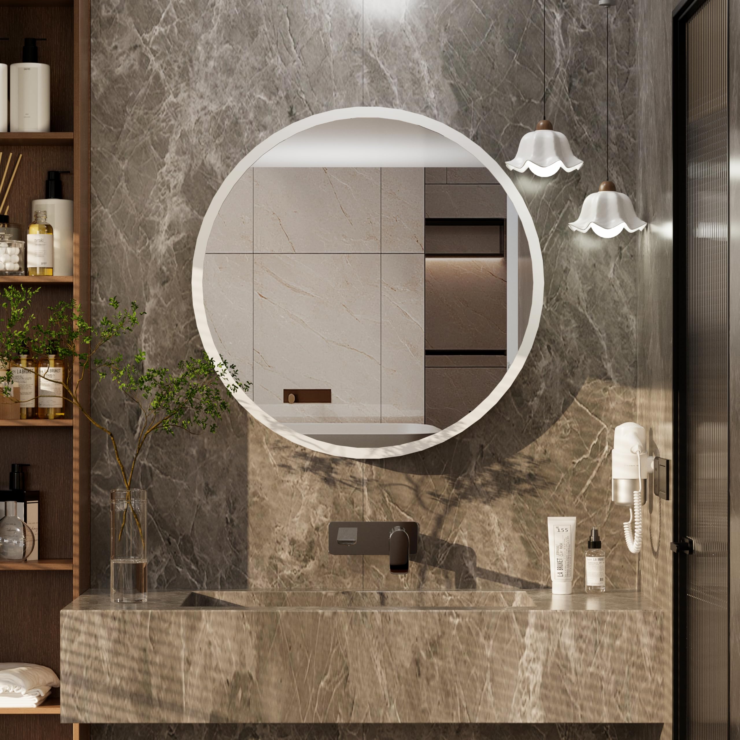 Espejo redondo para botiquín, espejo de baño con almacenamiento y estante, montaje en pared en superficie, espejo de tocador de ma