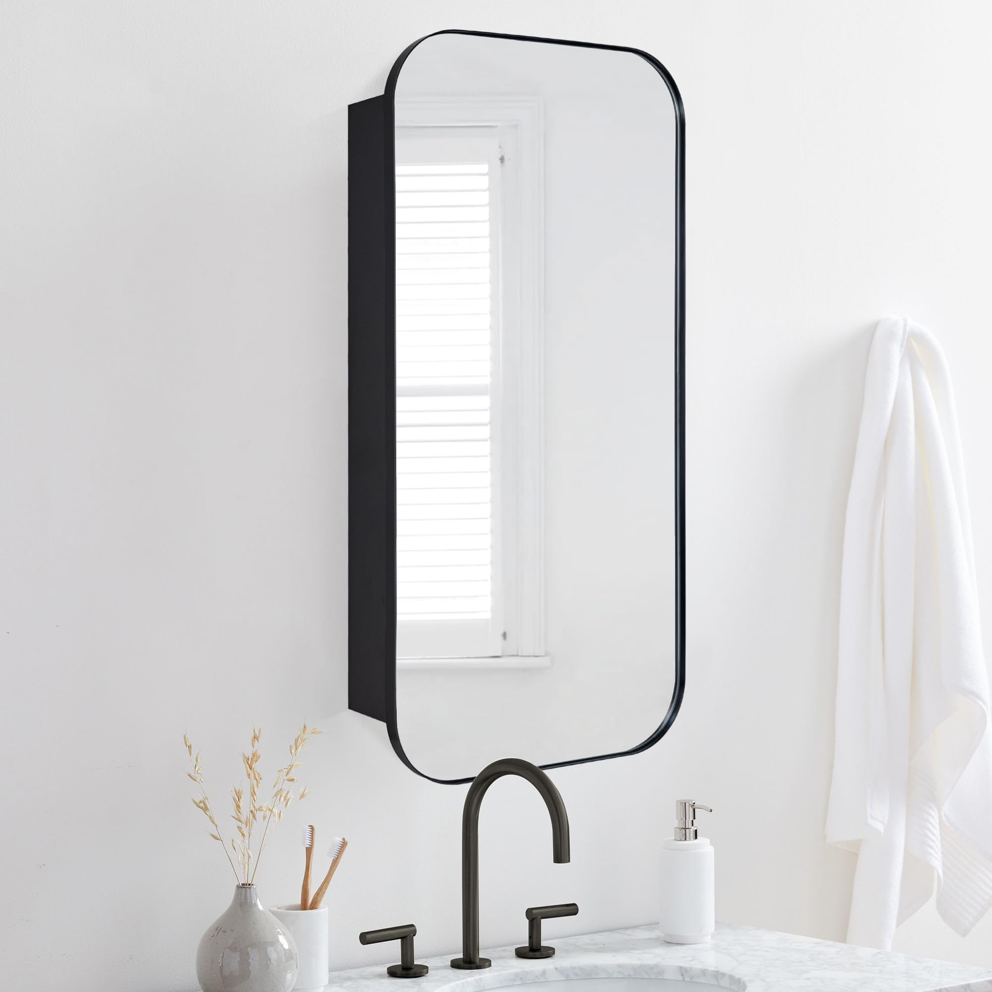 Movo Botiquín de medicina con espejo, 16 x 24 pulgadas, marco de metal negro, empotrado, gabinete de medicina empotrado para baño,