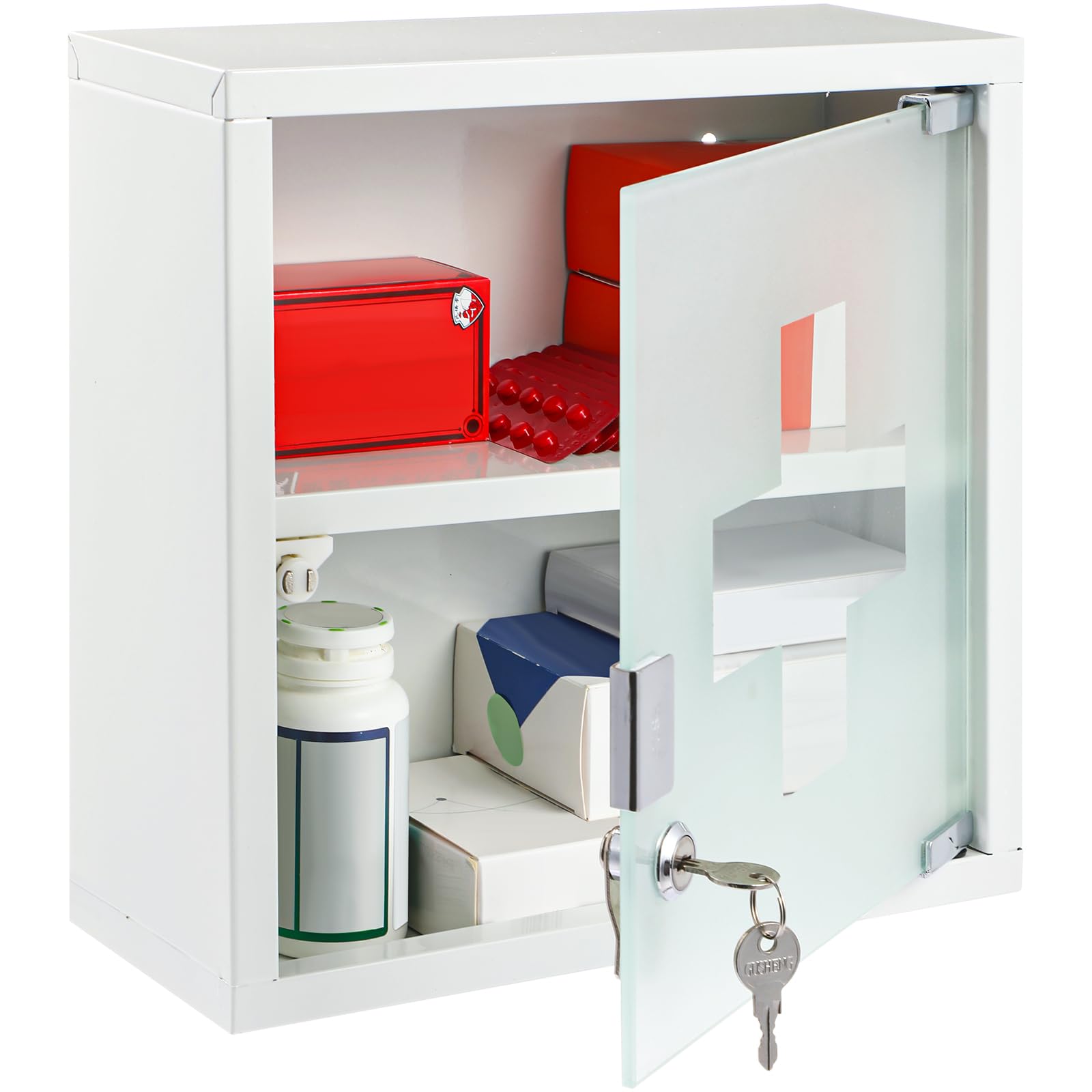 Timgle Armario de pared de primeros auxilios con cerradura, botiquín montado en la pared, armario médico colgante con puerta de vi
