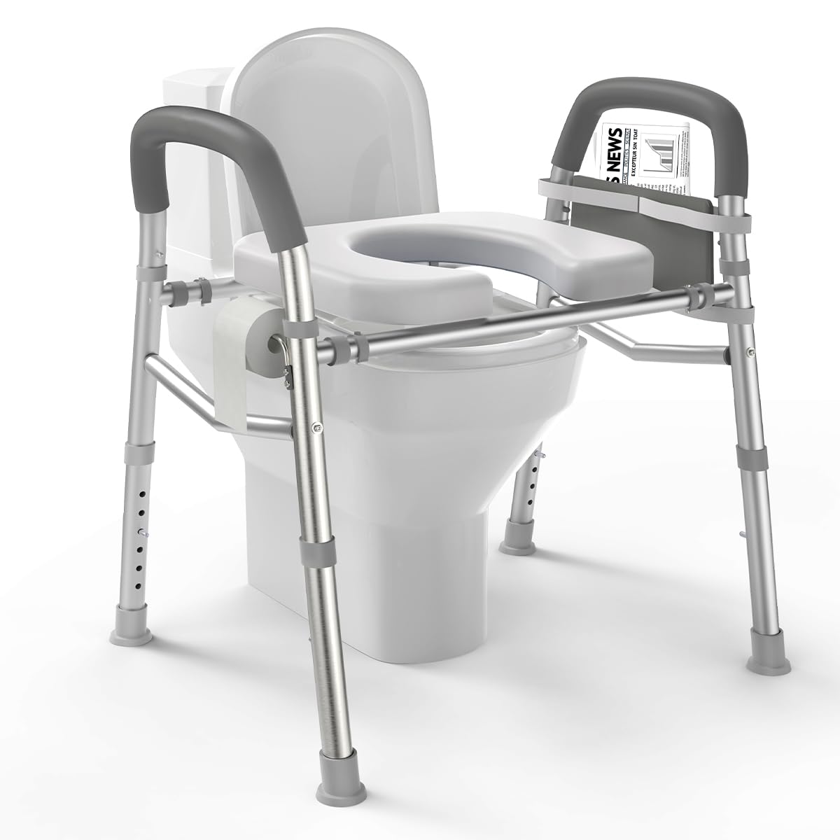 Asiento de inodoro elevado con asas, marco de seguridad médica resistente de 400 libras, asistencia de baño para personas mayores,