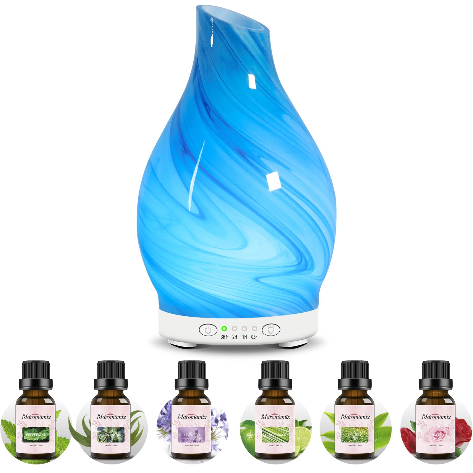 Juego de difusor de aceite esencial y aceites esenciales, difusor ultrasónico de aromaterapia de vidrio con 6 aceites esenciales,