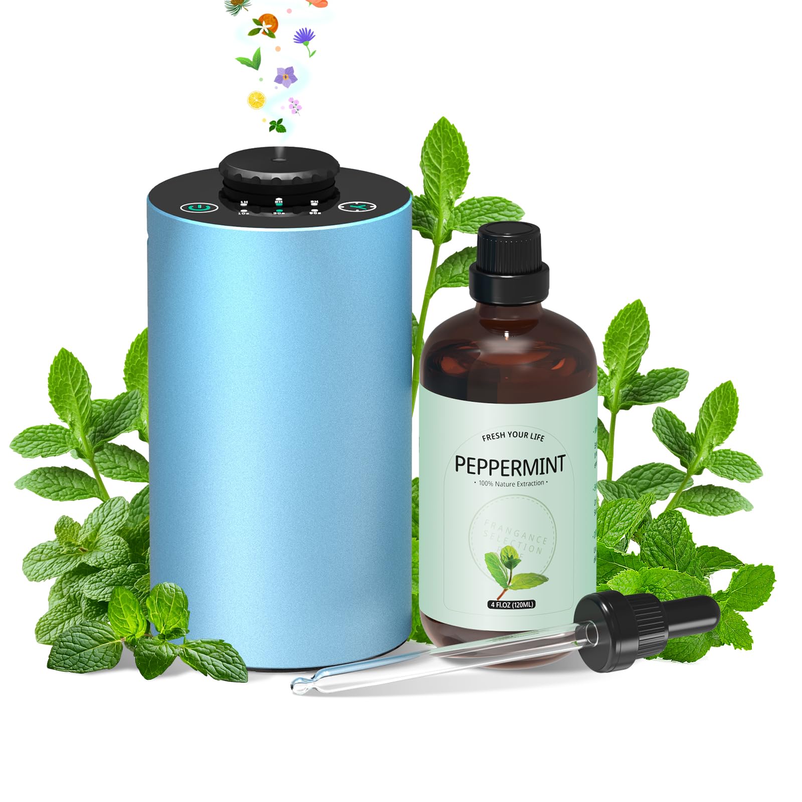 Difusor sin agua para nebulizador de aceite esencial funciona con pilas con 3 modos de niebla, 4 temporizadores, LED de 7 colores,