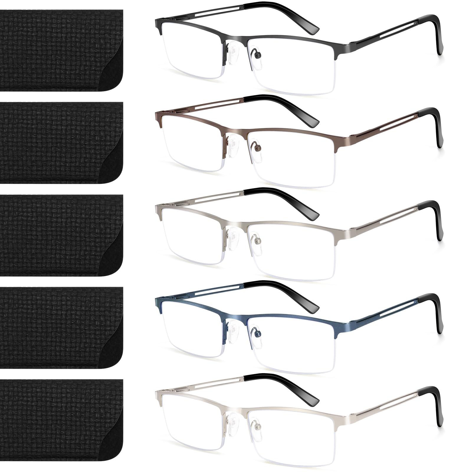 Paquete de 5 lentes de lectura con bloqueo de luz azul estilo Archives para hombre, marco de medio metal, bisagra de resorte, lect