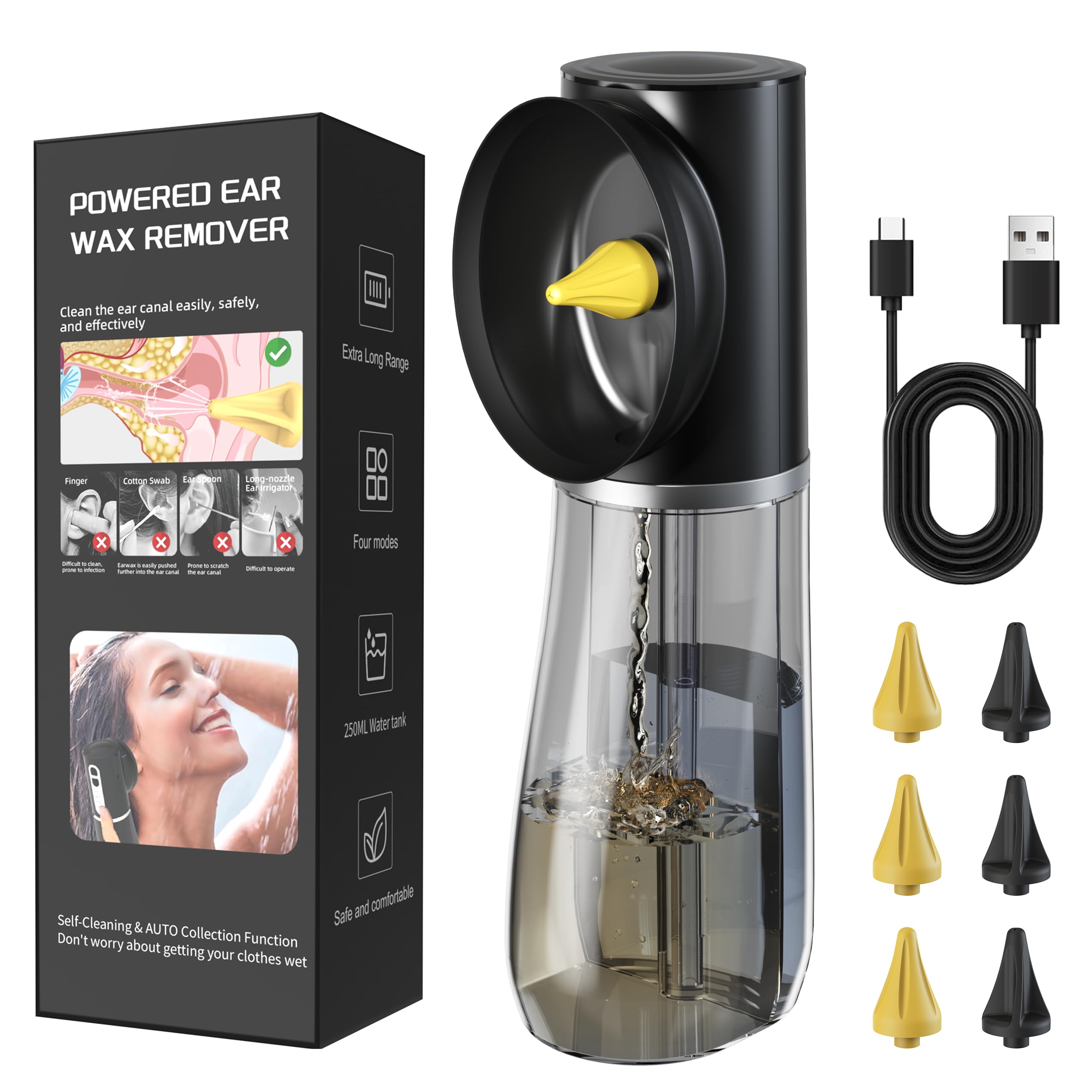 Eliminación eléctrica de cera de oído, kit de limpieza de oídos con 6 puntas y 3 modos de presión, sistema de lavado de riego de o