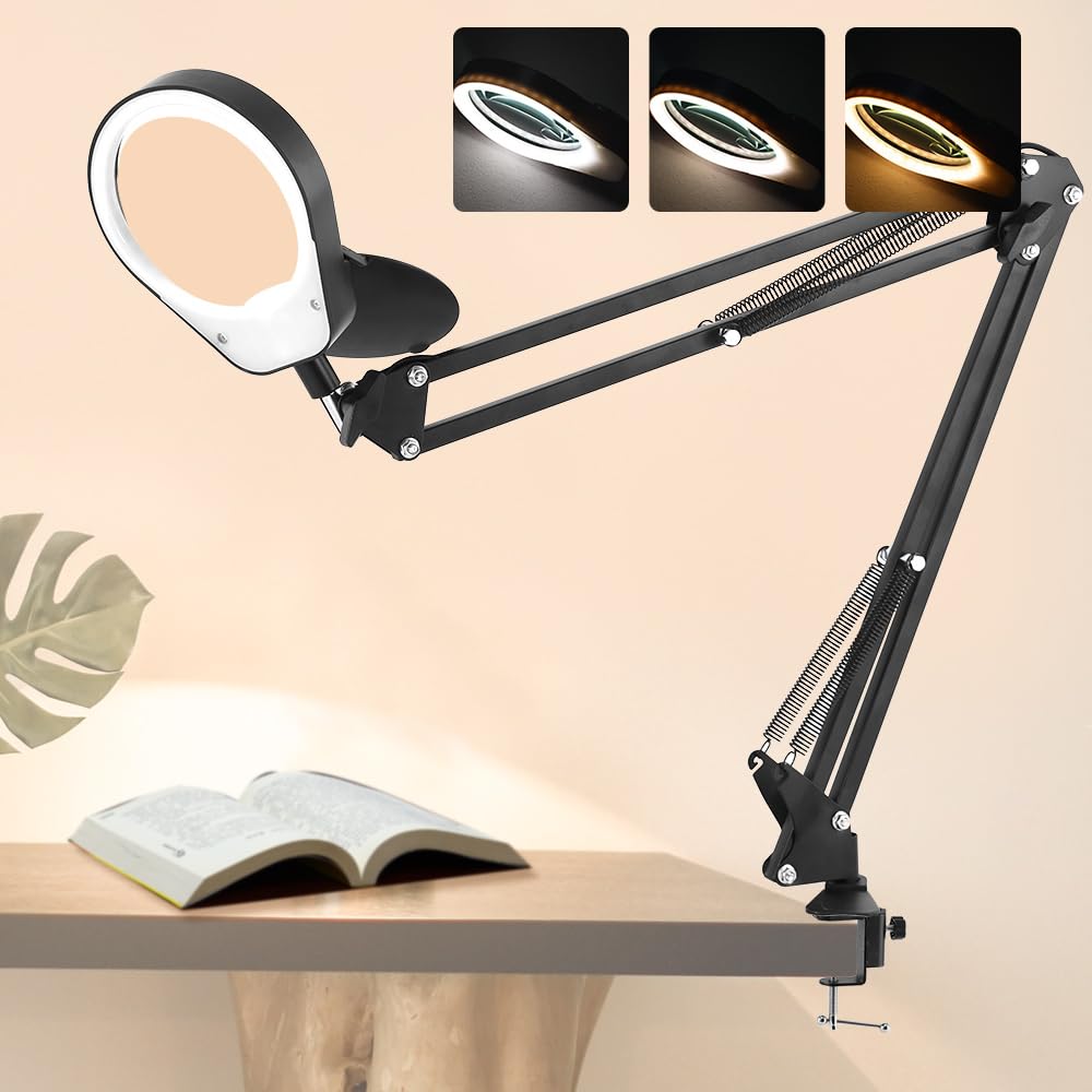 Drdefi 10 lupas con luz y soporte, lámpara de pie con brazo oscilante ajustable 3 en 1, 5 modos de color, lámpara de lupa con luz