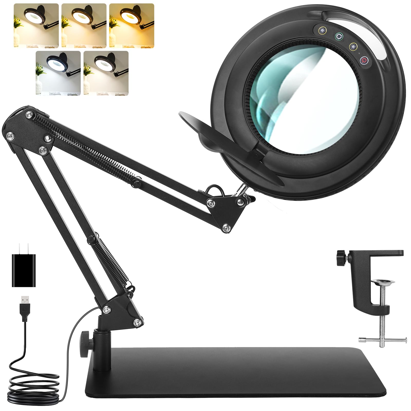 10 lupas con luz y soporte, lámpara de pie con lupa LED de brazo giratorio ajustable 3 en 1, 5 modos de color, brillo, atenuación