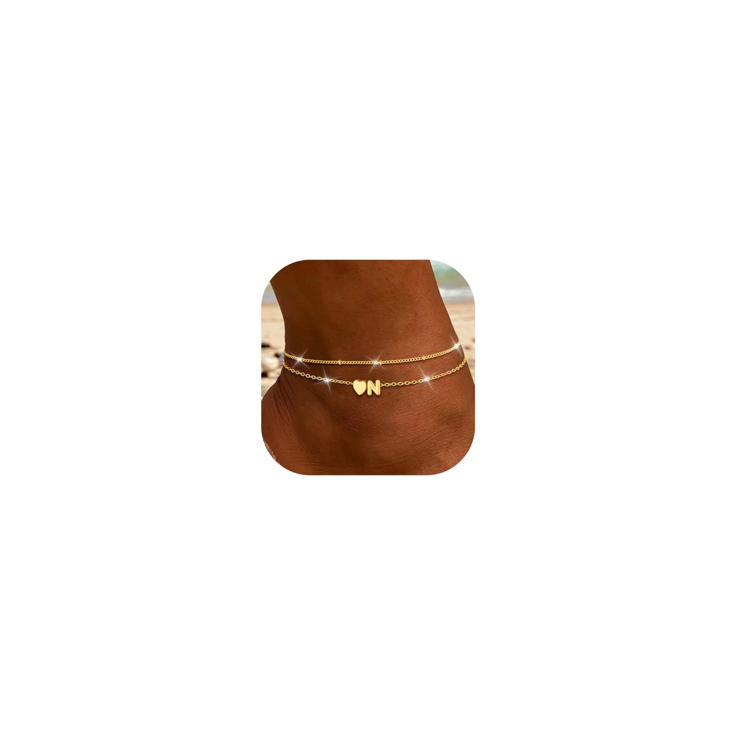 Turandoss – Tobillera en capas con dije de corazón con iniciales para mujer, chapado en oro de 14 quilates, hecha a mano con capas