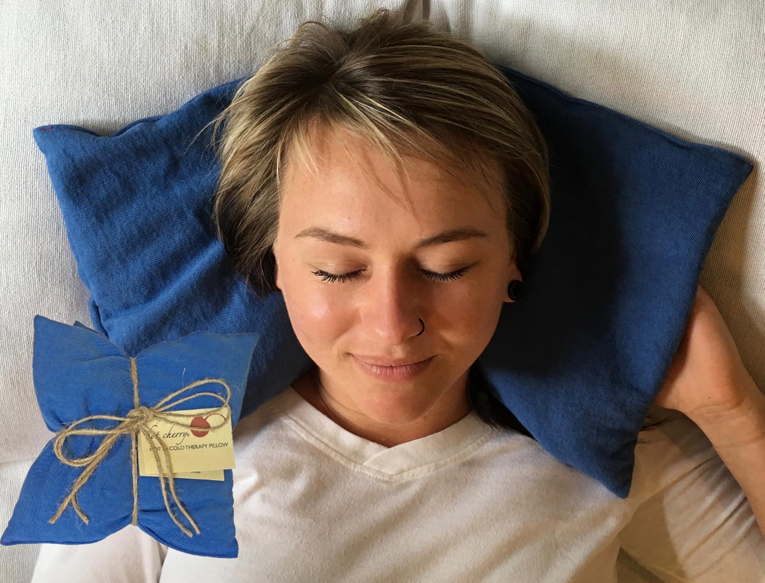 Almohada doble cuadrada azul de mezclilla con piedra de cerezo, compresa caliente/fría para microondas, almohadilla térmica sosten