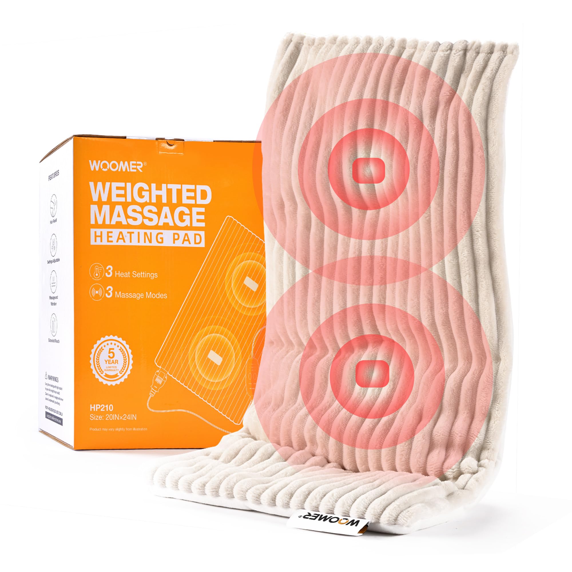 WOOMER Almohadilla térmica eléctrica de masaje con peso para dolor de espalda, alivio de calambres de cuello y hombros, 12 x 24 pu