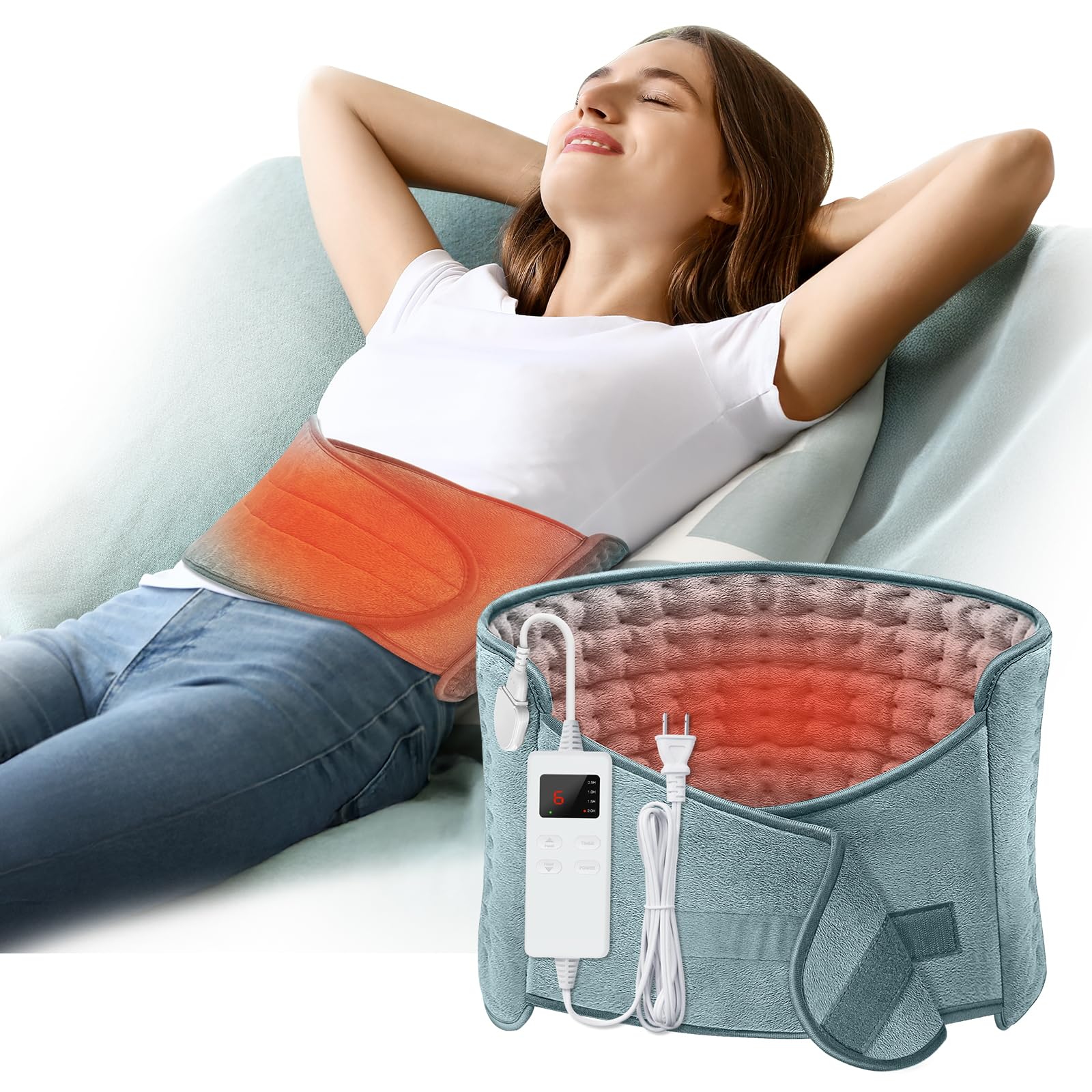 Almohadilla térmica, almohadilla térmica eléctrica para aliviar el dolor de espalda y calambres con cinturón, 4 temporizadores, 6
