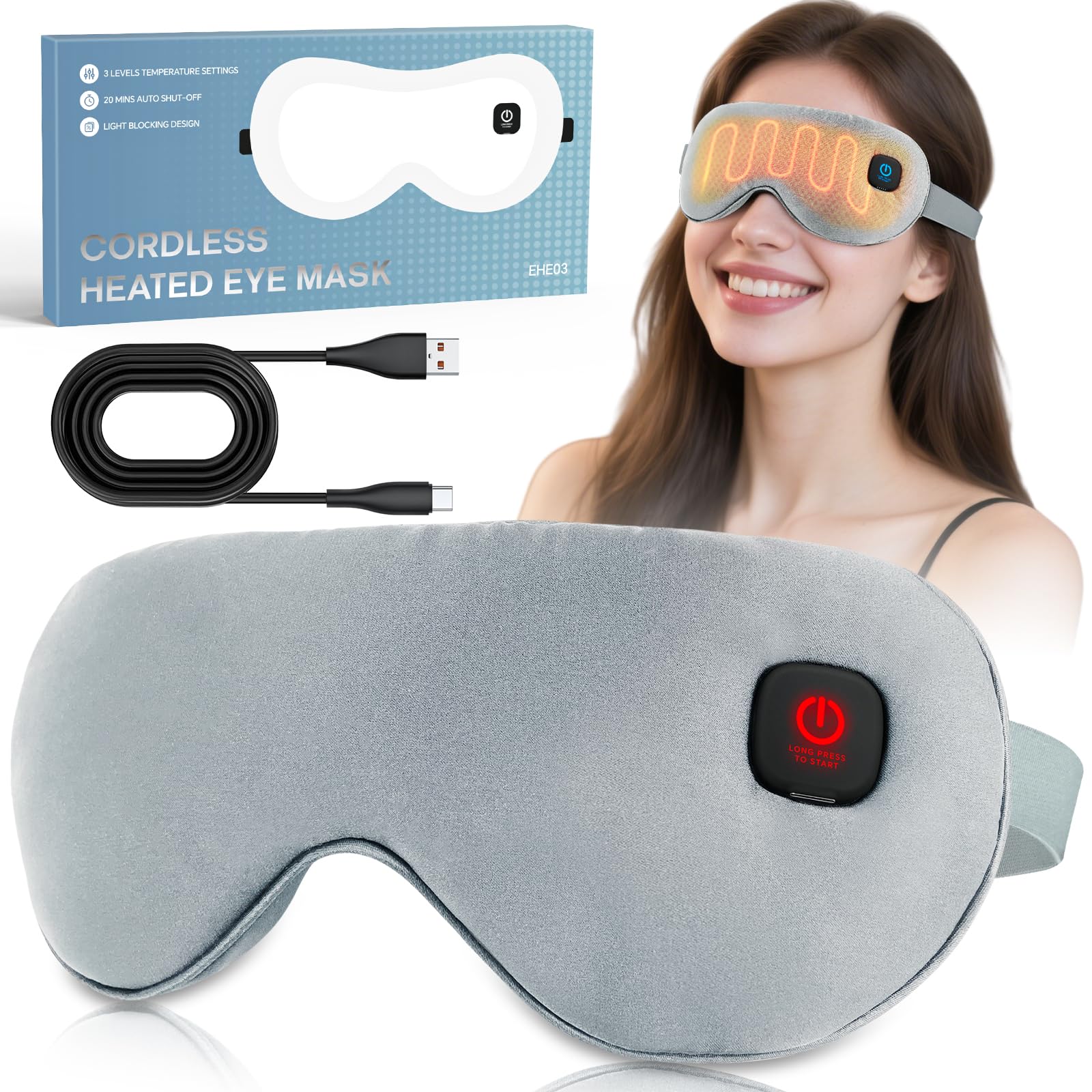 Máscara de ojos térmica para alivio de ojos secos, máscara de ojos inalámbrica con 3 ajustes de calor, cubierta de ojos lavable, a
